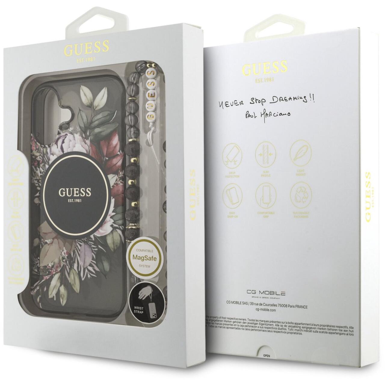 Husa Flowers Strap MagSafe iPhone 17 de la Guess, este alegerea ideala pentru cei care cauta un echilibru intre eleganta, protectie si functionalitate. Conceputa pentru a oferi un plus de stil telefonului tau, aceasta husa impresioneaza prin designul floral modern, logo-ul Guess incadrat intr-un cerc auriu si accesoriul unic: snurl cu bile tip perla – un detaliu de efect, dar si practic.