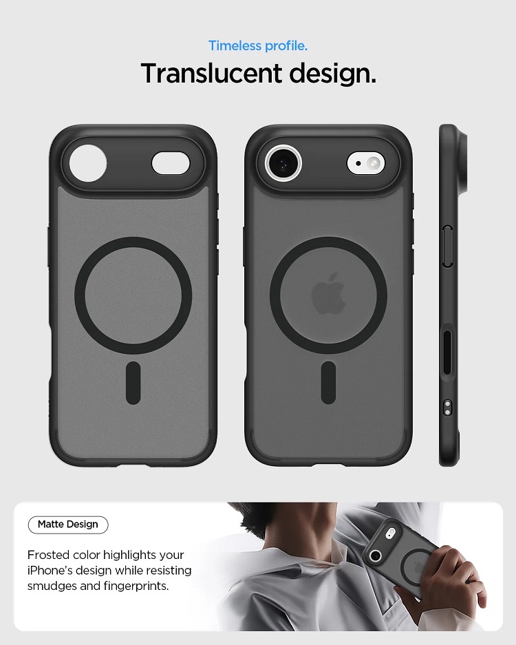 Husa Ultra Hybrid MagSafe iPhone Air de la Spigen, ofera o combinatie excelenta intre protectie, design minimalist si compatibilitate perfecta cu tehnologia MagSafe. Realizata din spate dur din policarbonat transparent mat (frosted) si margini flexibile din TPU, aceasta husa iti protejeaza telefonul fara sa-i ascunda stilul original.