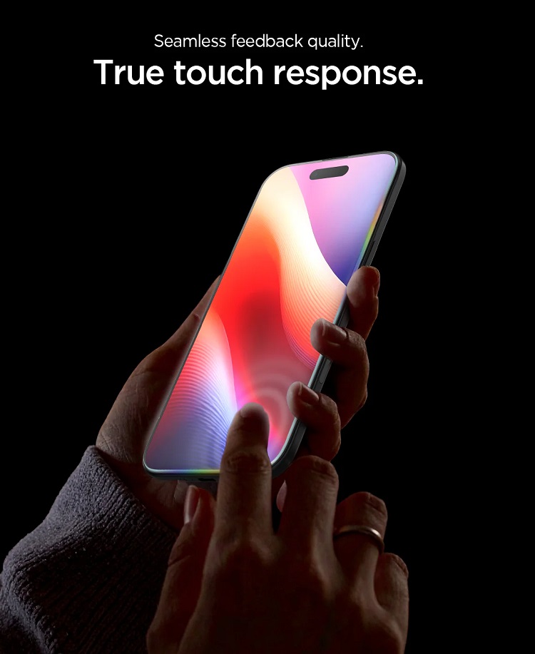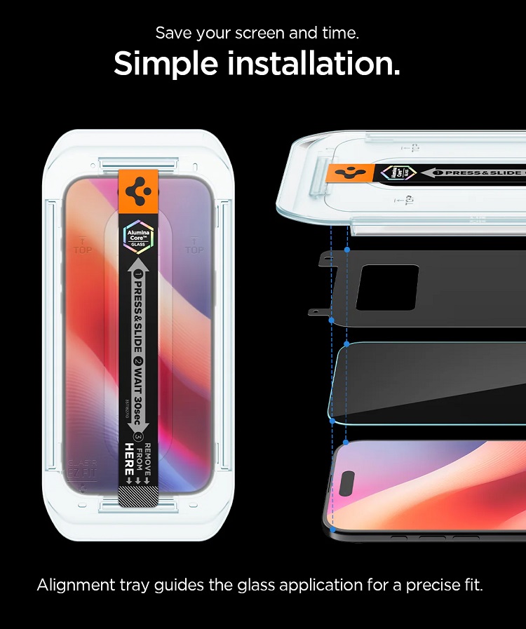 Spigen Folie Sticla cu aplicator inclus, este protejata de un cadru de montaj perfect decupat in fata telefonului, datorita caruia il puteti pozitiona perfect pe ecran.