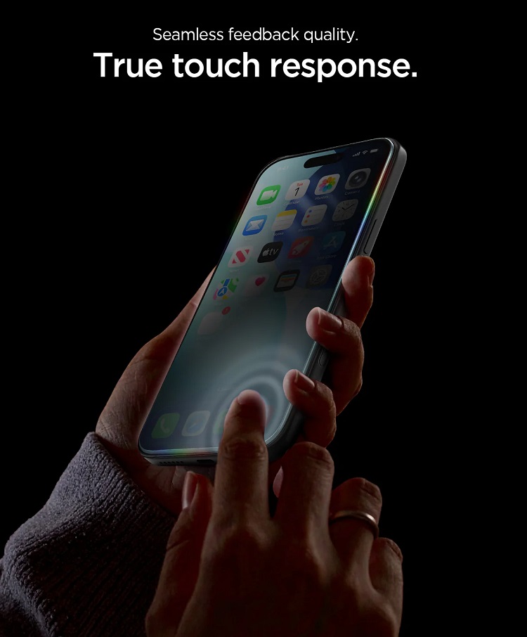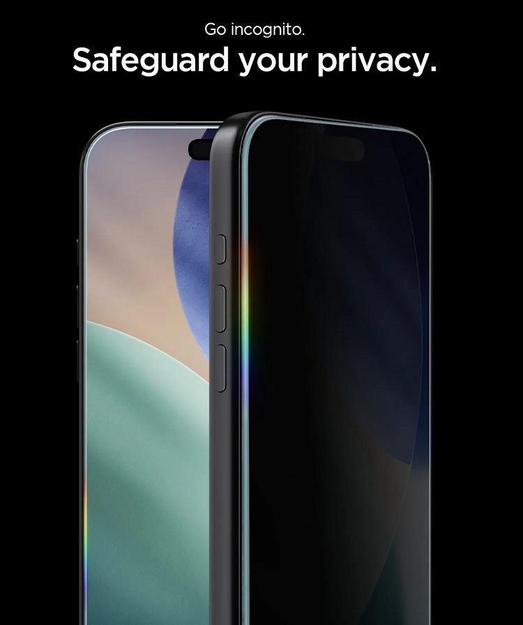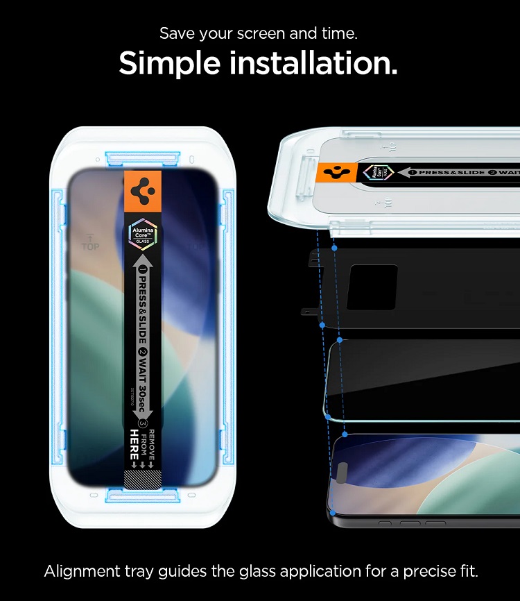 Pachet 2 buc Folie Sticla Privacy cu aplicator inclus de la Spigen, este protejata de un cadru de montaj perfect decupat in fata telefonului, datorita caruia il puteti pozitiona perfect pe ecran.