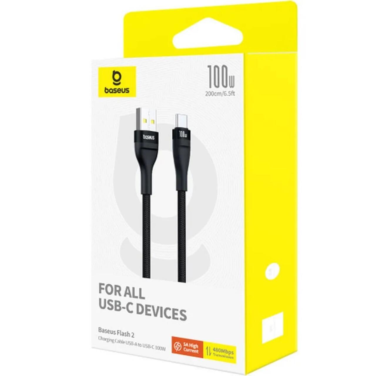 Baseus Cablu Flash 2 USB-A la Type-C Fast Charging, 100W PD QC, 5A, 2 m, Negru