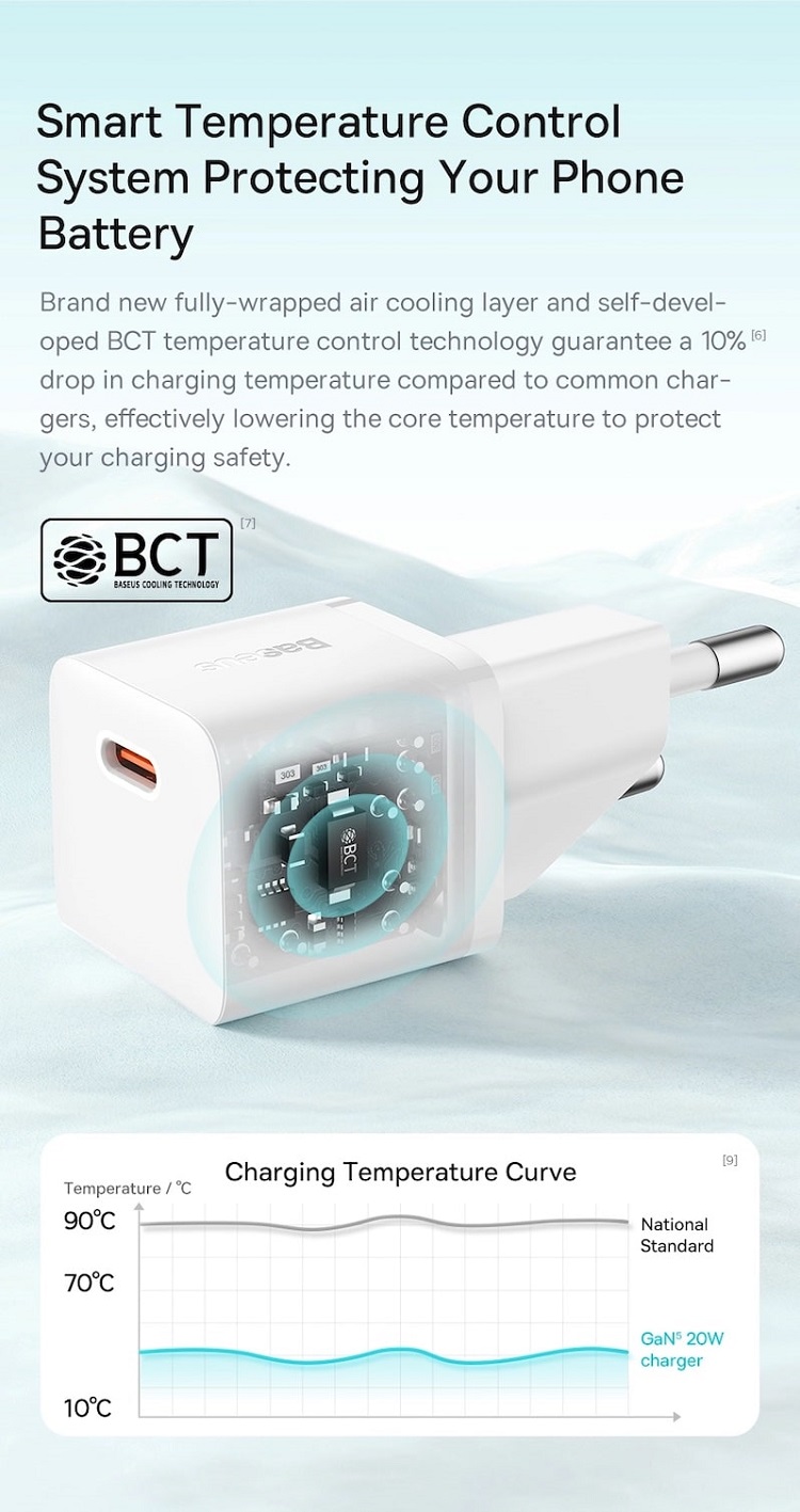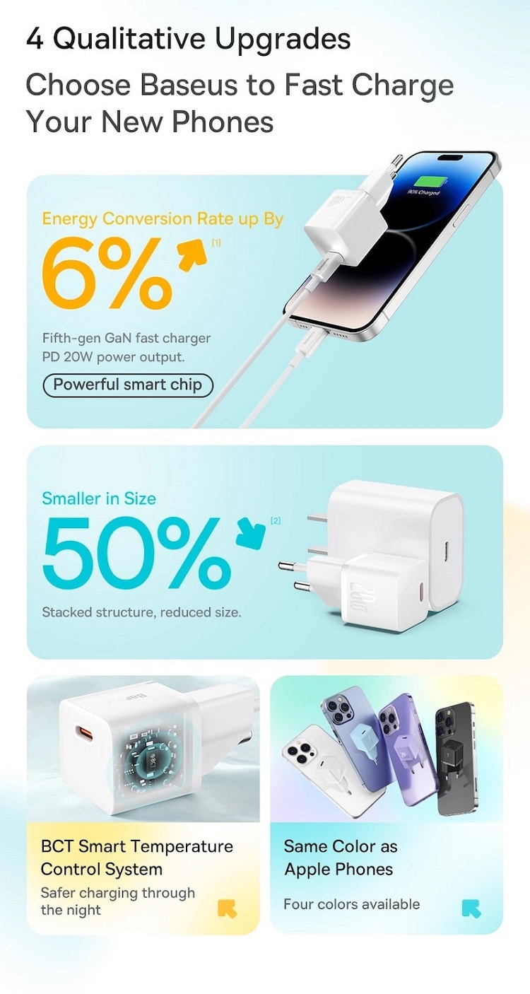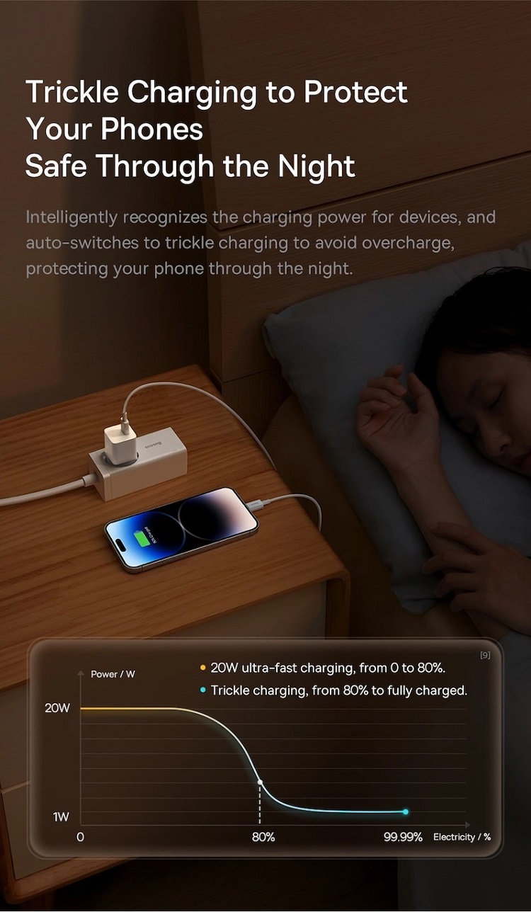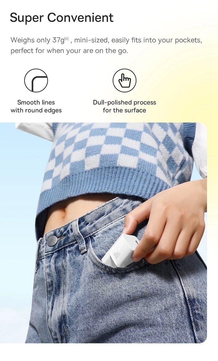 In ciuda dimensiunilor sale mici, acest incarcator ascunde o putere reala de 20 W, si este capabil sa va incarce telefonul la 50% in doar 26 de minute. Este perfect pentru cei care apreciaza atat eficienta, cat si caracterul practic. Acest incarcator este dovada ca o putere mare poate incapea intr-un pachet mic.