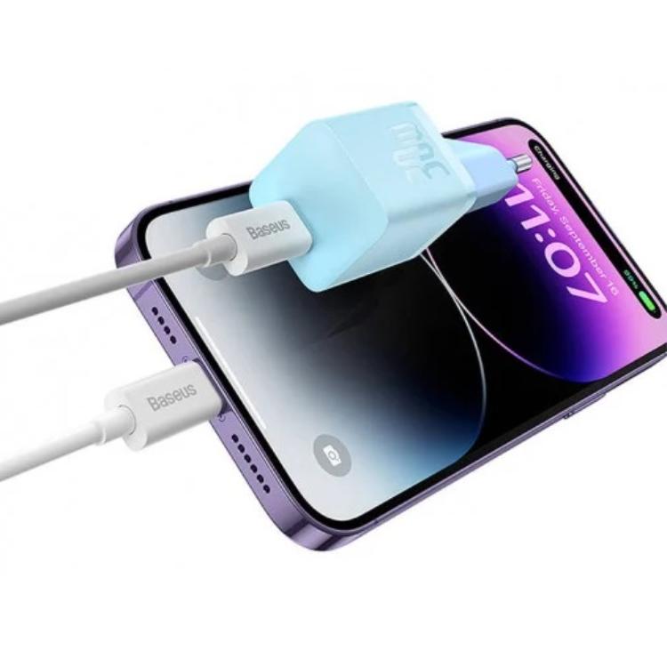 Incarcator Retea GaN5 Mini Fast Charger de la Baseus, este echipat cu tehnologie GaN, ceea ce il face confortabil de utilizat, dar in ciuda dimensiunilor sale mici acest incarcator ascunde o puterea de 30W si poate incarca telefonul cu pana la 57% in doar 30 de minute.