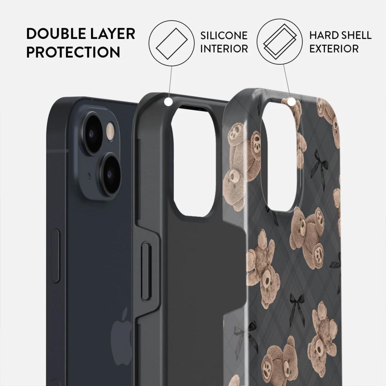 Are un design care imbina inocenta si rafinamentul cu ursuleti de plus si un fundal gri sic, husa este o intoarcere la nostalgia reconfortanta si actualizata cu o nota de glam modern.