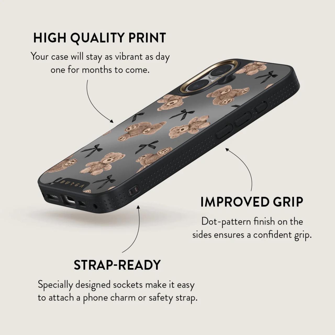 BFF -un design care imbina inocenta si rafinamentul. Cu ursuleti de plus si un fundal gri sic, BFF este o intoarcere la nostalgia reconfortanta a tineretii, actualizata cu o nota de glam modern. Acest design va va face pe dvs. si carcasa telefonului dvs. iPhone 16 insotitori inseparabili, la fel ca cei mai buni prieteni.