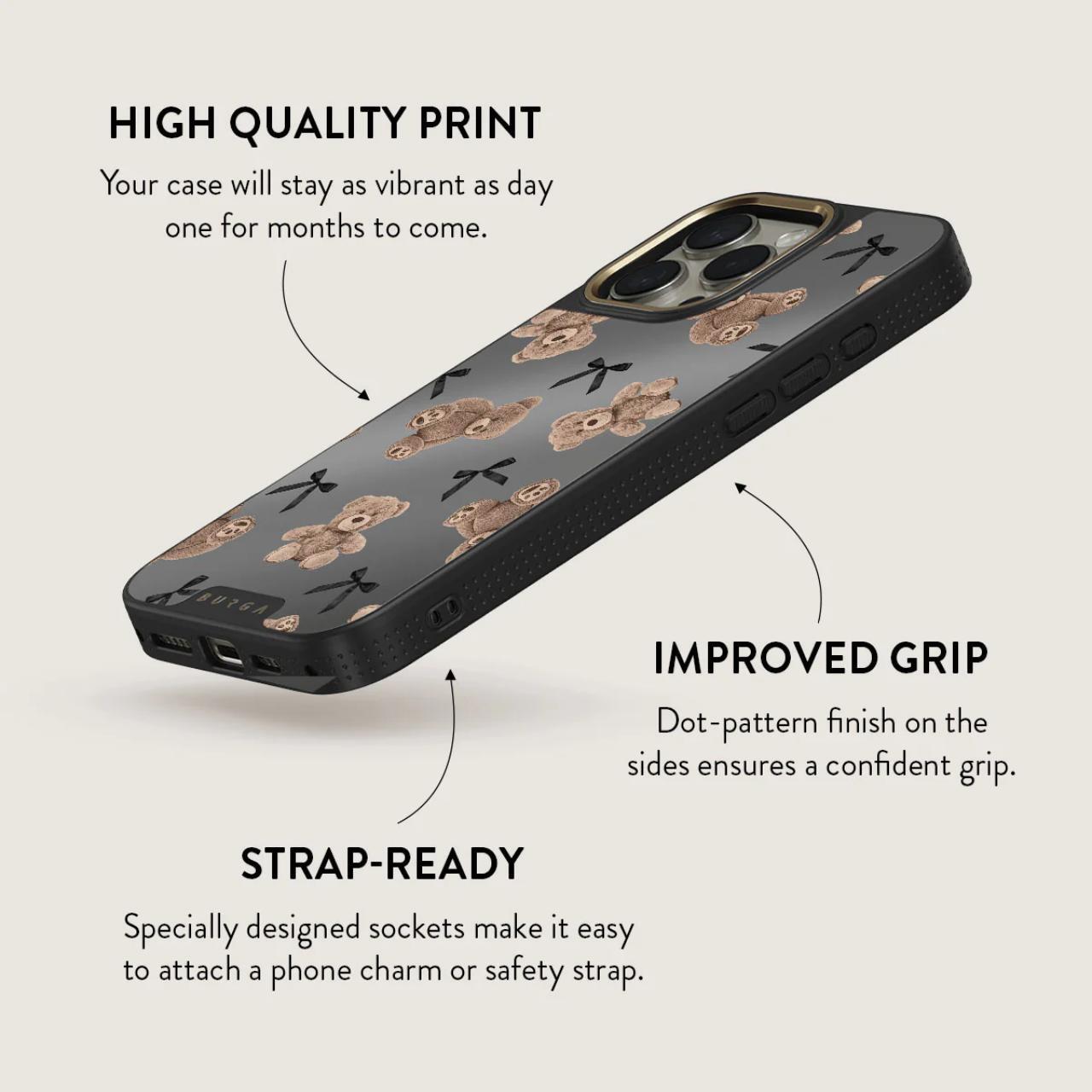 BFF -un design care imbina inocenta si rafinamentul. Cu ursuleti de plus si un fundal gri sic, BFF este o intoarcere la nostalgia reconfortanta a tineretii, actualizata cu o nota de glam modern. Acest design va va face pe dvs. si carcasa telefonului dvs. iPhone 16 Pro insotitori inseparabili, la fel ca cei mai buni prieteni.