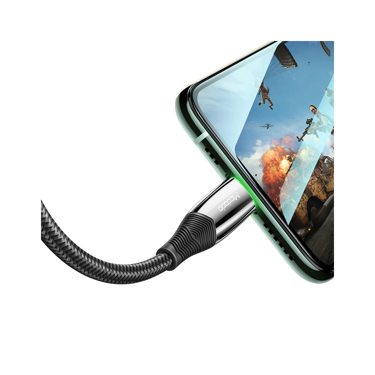 Cablu de incarcare de la Mcdodo Shark Series Lightning cu impletitura nylon pentru telefoane si tablete, cu lungimea de 1,2 metri, invelis textil (anti-incalcire) pe toata lungimea si protectii pentru mufe din aliaj de zinc Gold anticoroziv, cu extensii de legatura din silicon pentru o durabilitate mai buna.