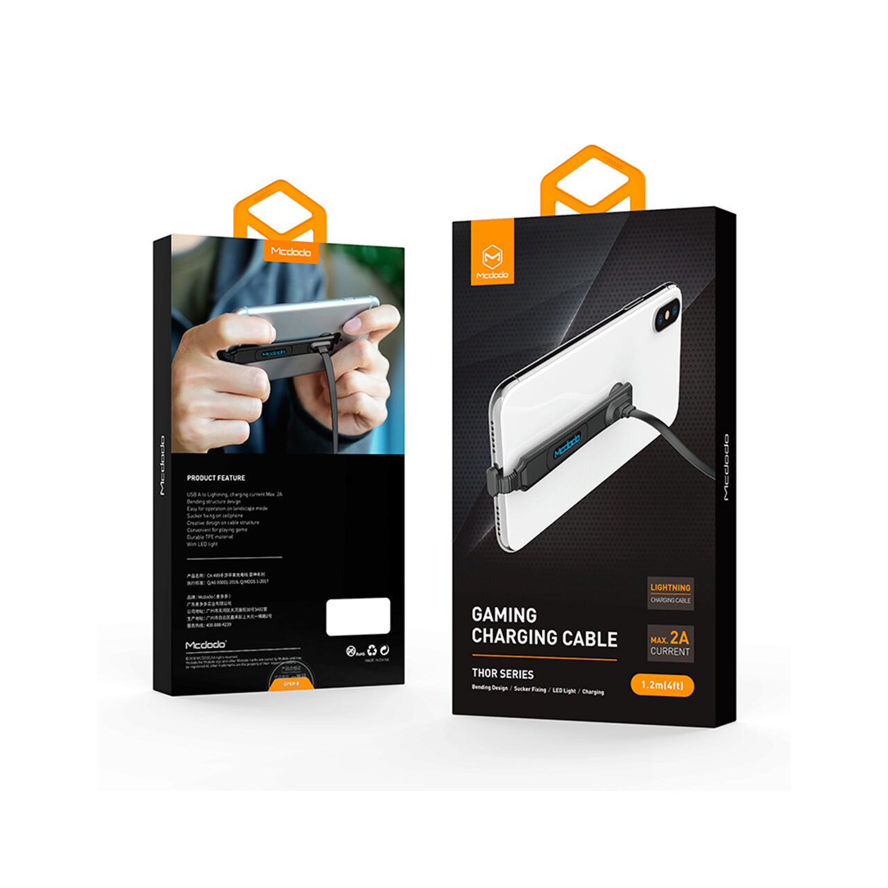 Cablul Thor Series Gaming Lightning de la Mcdodo se poate utiliza atat pentru incarcare cat si pentru sincronizare date impreuna cu dispozitivele cu conector Lightning. Este realizat din material plastic flexibil pentru o rezistenta sporita, iar pentru a fi protejat impotriva ruperii prezinta o protectie din material cauciucat la intalnirea dintre cablu si mufe.