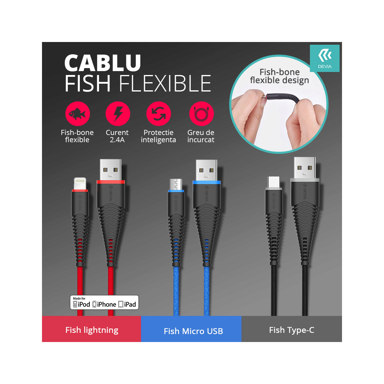 Cablul Fish MFI produs de Devia are lungimea de 1.5 m si este fabricat din material PVC flexibil (Nylon), foarte rezistent la indoire si la uzura de zi cu zi. Poate fi folosit pentru incarcare sau transfer date, special creat pentru toate dispozitivele cu conector Lightning. Impletitura de nylon are aspect de material textil si face cablul un accesoriu elegant si placut la atingere.