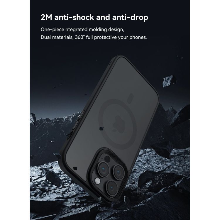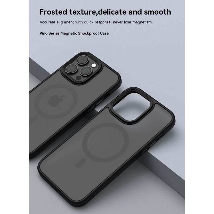 Husa Pino Series Magnetic Shockproof pentru iPhone 15 Pro Max, are spatele dur realizat din Policarbonat si marginile flexibile din TPU silicon. Husa este semi-transparenta pe spate si are marginile negre, ce ofera o priza buna in mana, dar si un design deosebit.