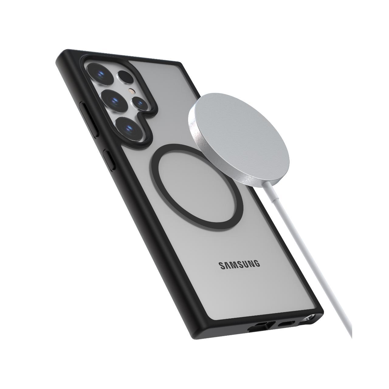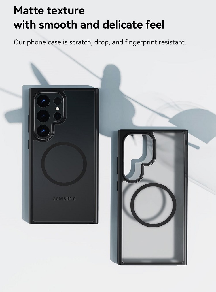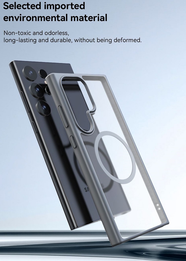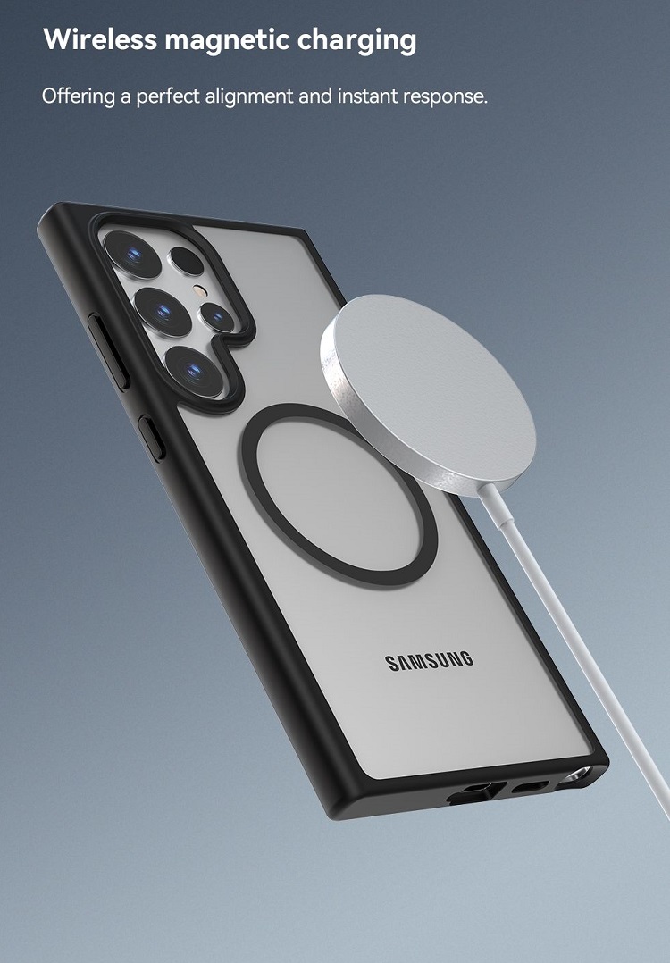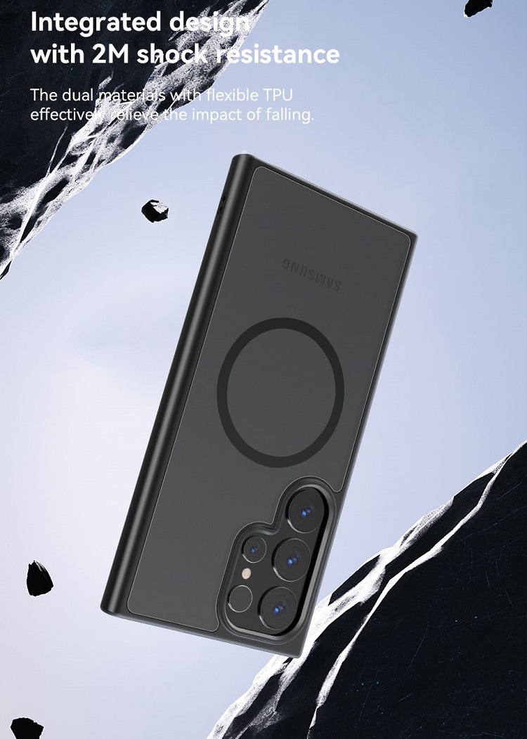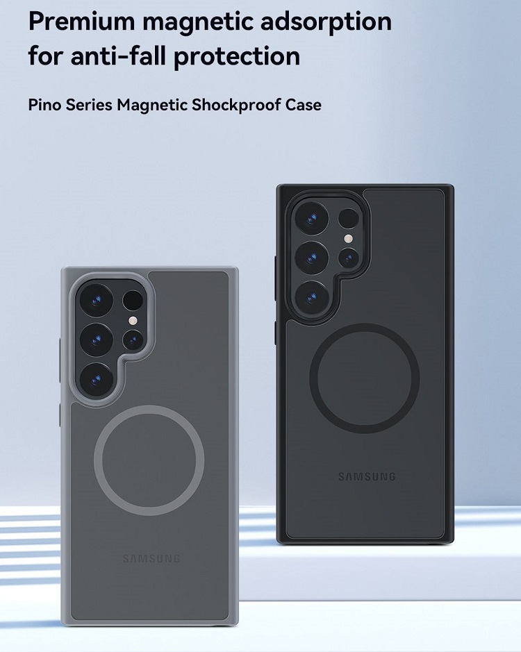 Husa Pino Series Magnetic Shockproof pentru Samsung Galaxy S24 Ultra are spatele dur realizat din Policarbonat si marginile flexibile din TPU silicon. Husa este semi-transparenta pe spate si are marginile negre, ce ofera o priza buna in mana, dar si un design deosebit.