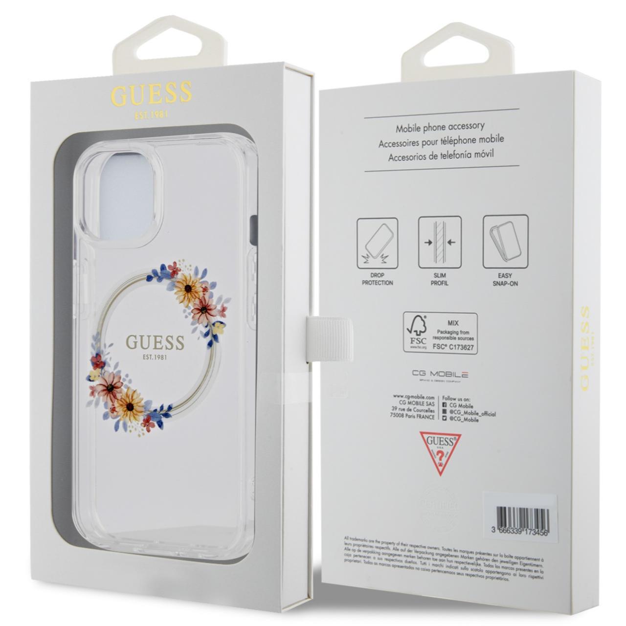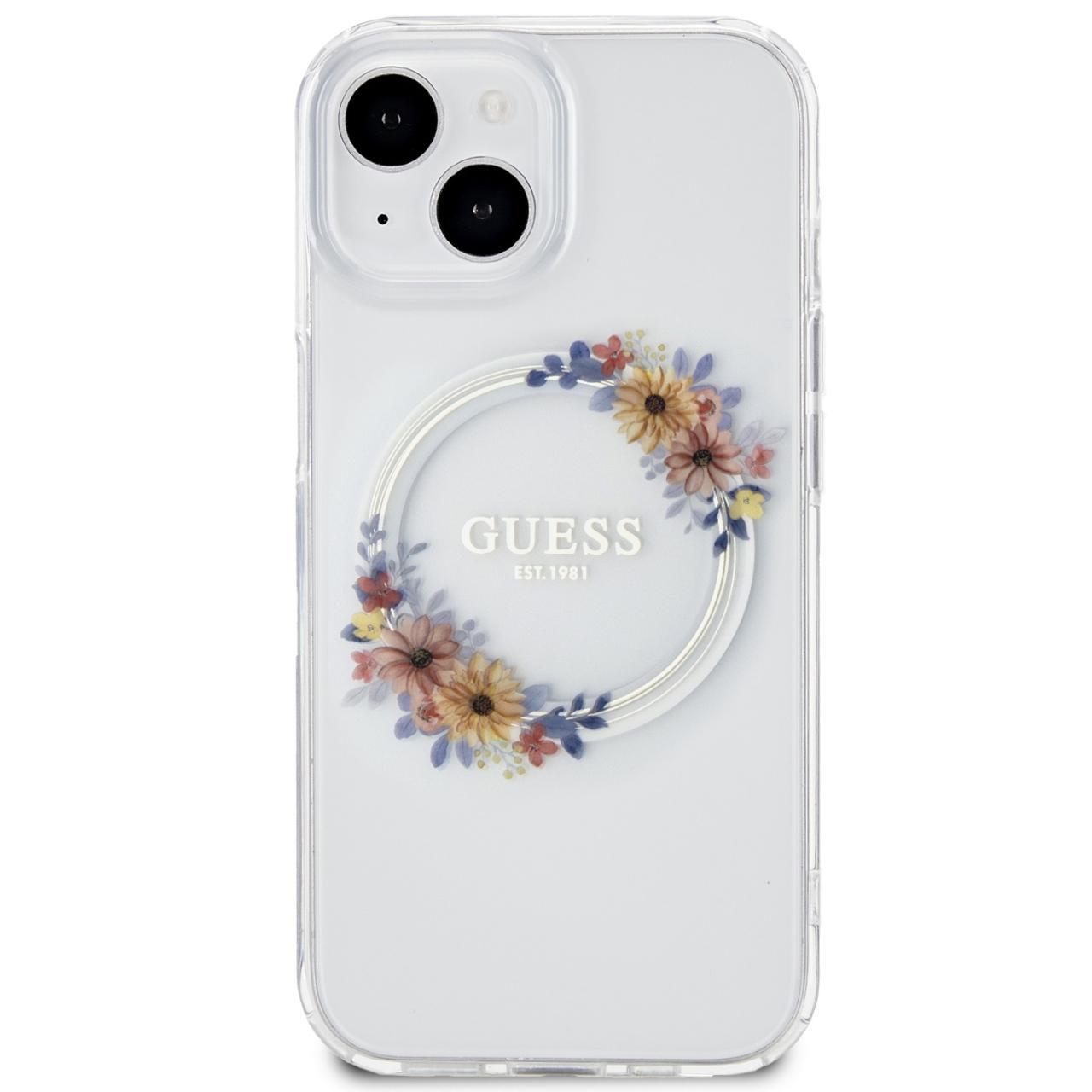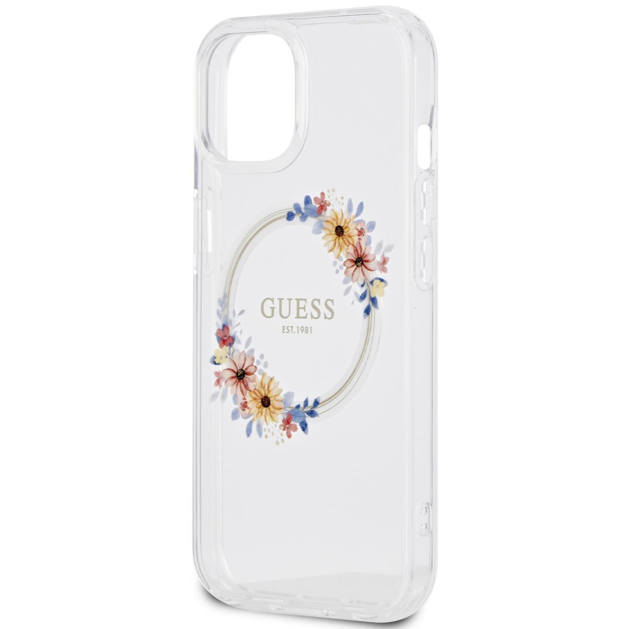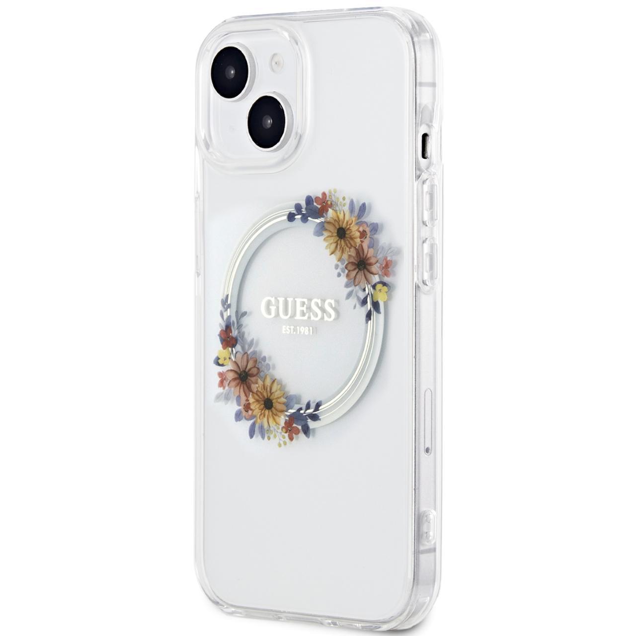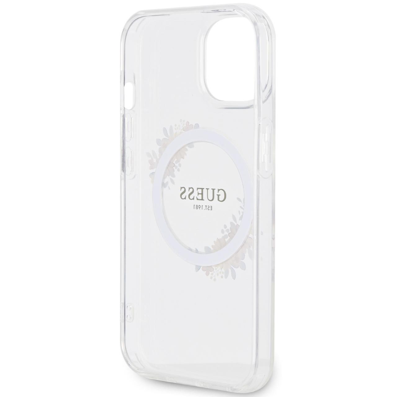 Guess Husa Flowers Ring Logo Glossy MagSafe iPhone 15 Transparent