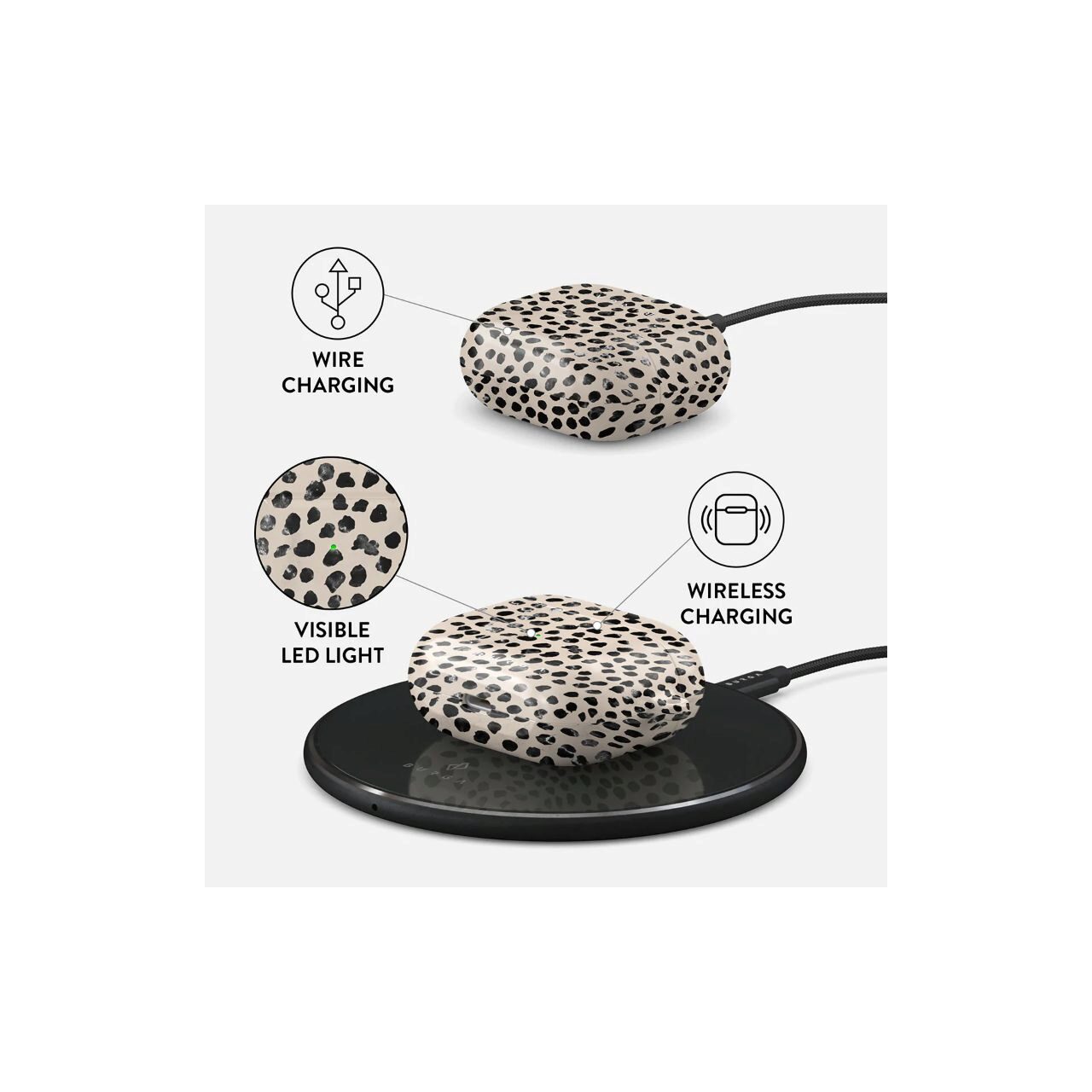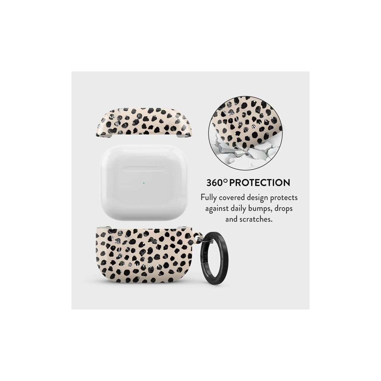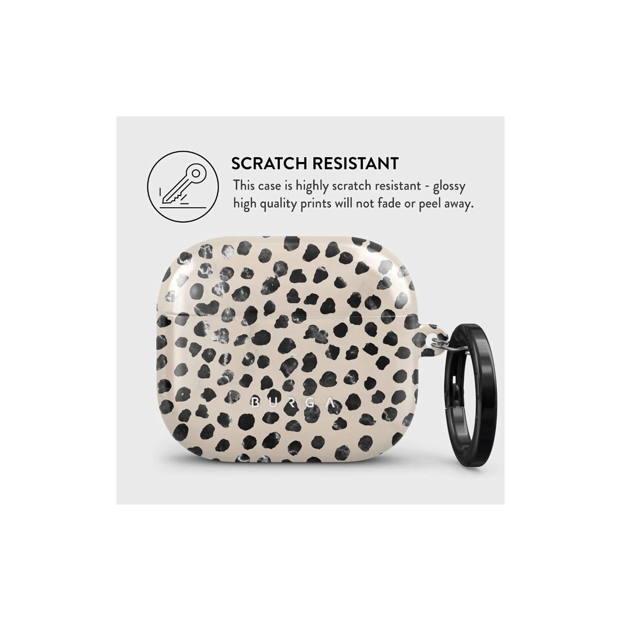 Nu va perturba capacitatile de incarcare wireless ale modelului Exista chiar si un indicator luminos cu LED pentru a dovedi acest lucru (nu va faceti griji, incarcarea cu fir functioneaza in continuare). Cand este montata, husa BURGA va proteja carcasa delicata Apple Airpods 3 de sub ea de zgarieturi, lovituri si caderi, ramanand in acelasi timp fara zgarieturi. Imprimeurile cu modele de design sunt de inalta calitate si nu se vor dezlipi sau decolora niciodata - datorita tehnologiei noastre unice de imprimare. Si, in cele din urma, o carabina la indemana este acolo pentru a va face viata mai usoara si mai convenabila: pur si simplu puneti-o in jurul cheilor sau buclei de centura si abordati ziua din fata.