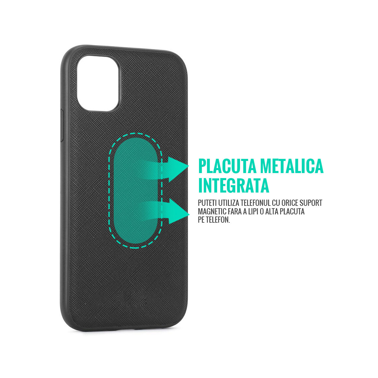 Ofera un aspect elegant si confera stabilitate telefonului in mana datorita pielii texturate. Are integrata o placuta metalica pentru compatibiliate cu majoritatea suporturilor magnetice.