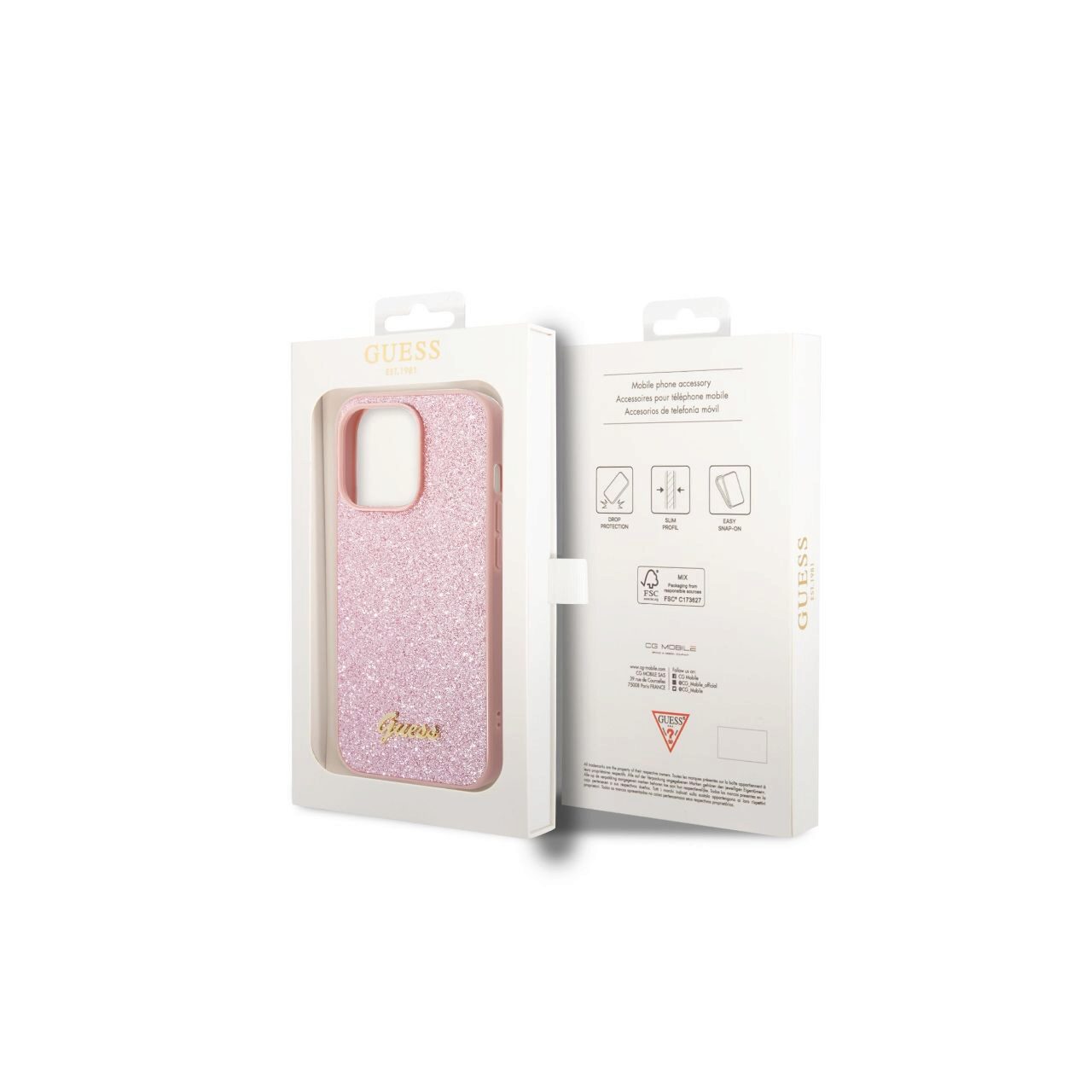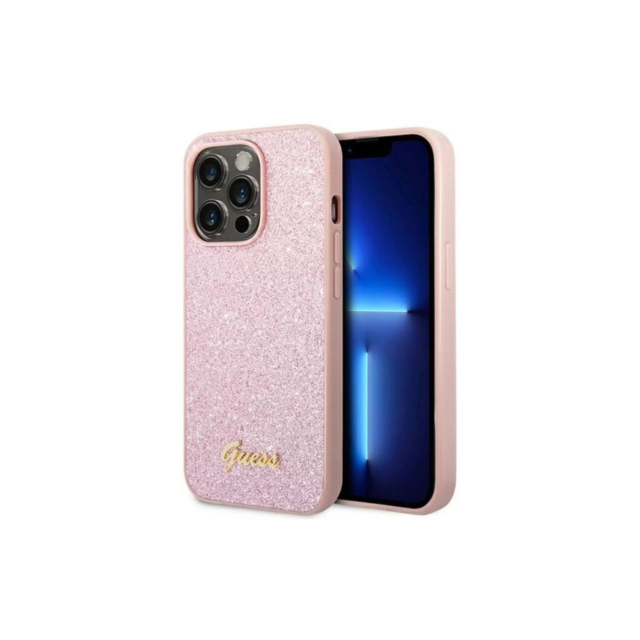Husa Glitter TPU Flakes Script Metal Logo pentru iPhone 14 Pro de la Guess este realizata dintr-un material special care contine sclipici placut la atingere, protejeaza perfect telefonul pe colturi si obiectivul camerei.