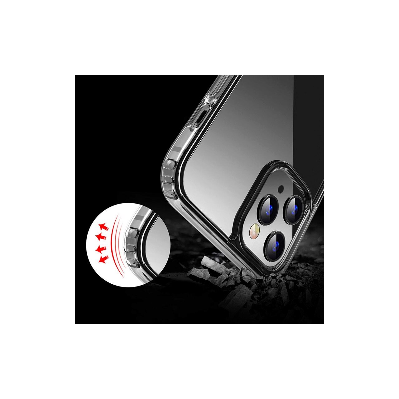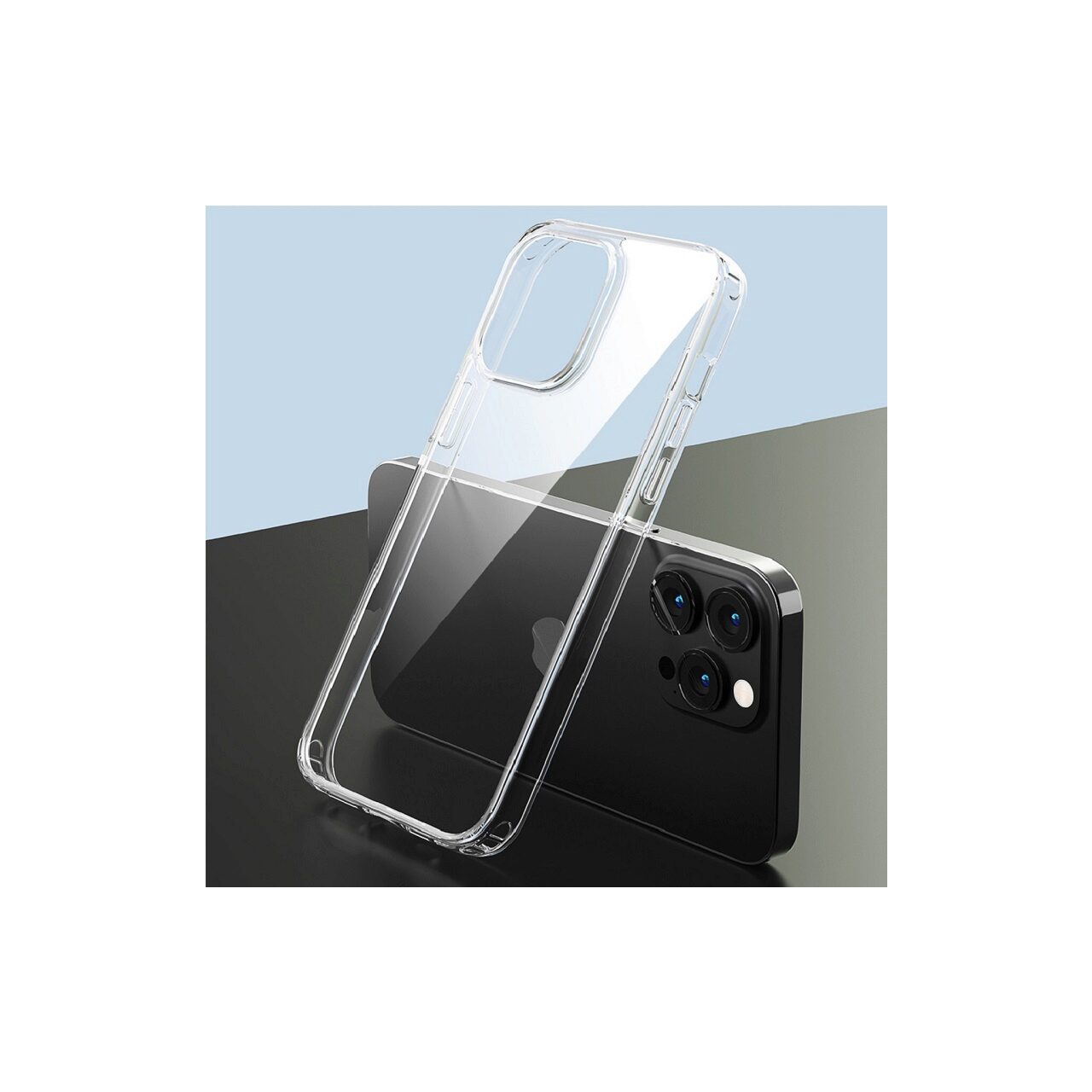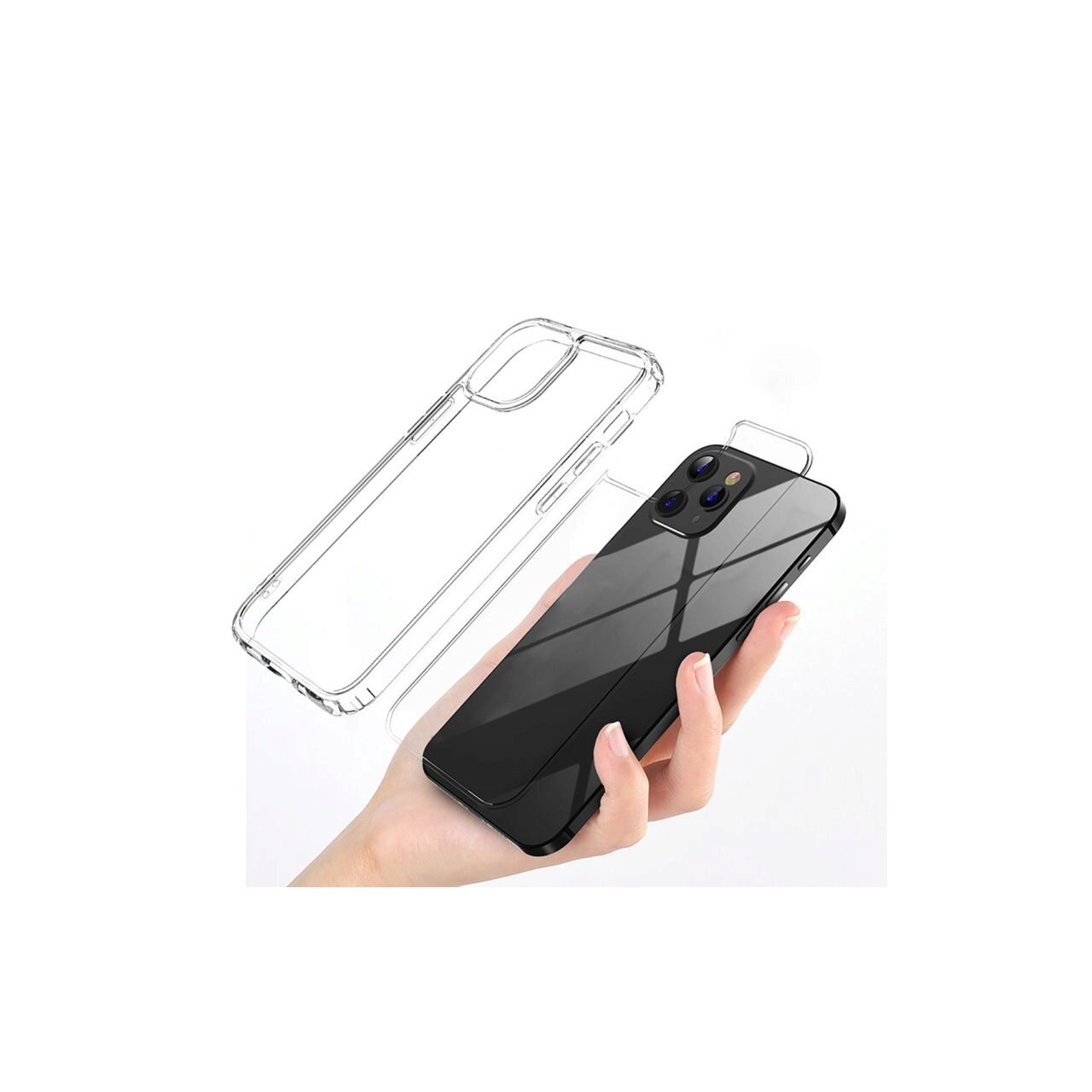 Husa este transparenta lasand la vedere culoarea telefonului.Pe spate are colturile usor inaltate pentru a proteja camerele atunci cand telefonul este asezat pe masa, birou sau alta suprafata plana.