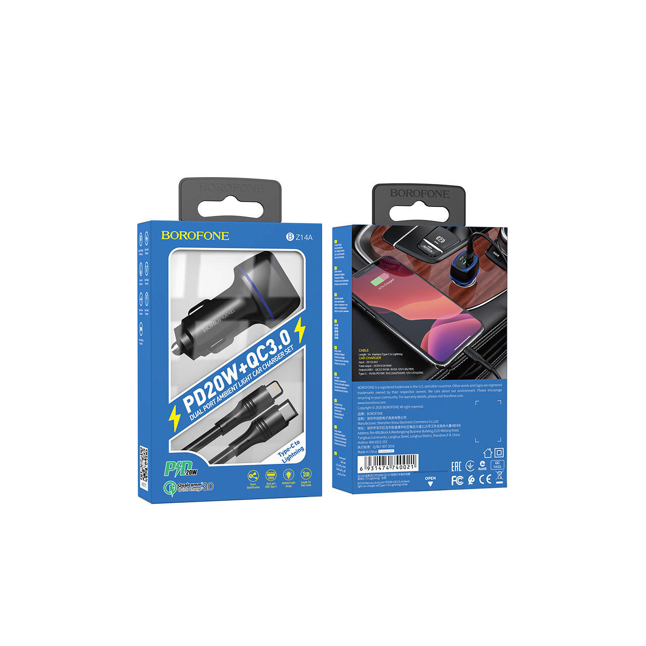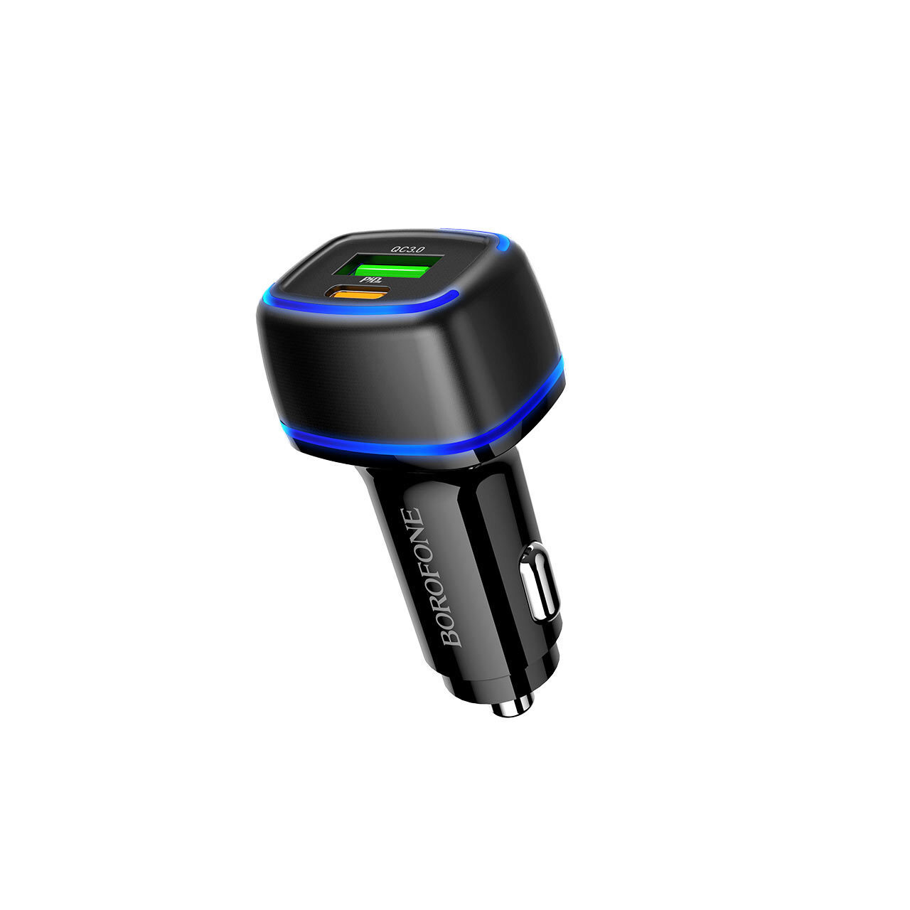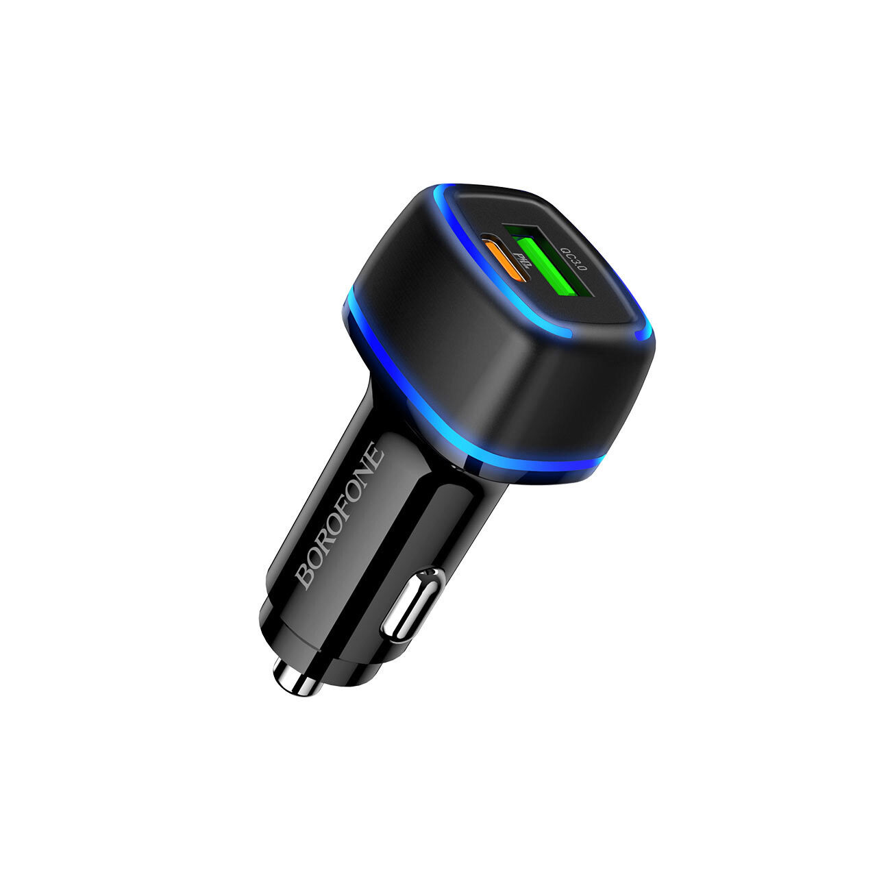 Borofone Incarcator Auto BZ14A Mercury USB si Type-C Black (QC 3.0, 20W, cablu Type-C la Lightning inclus)