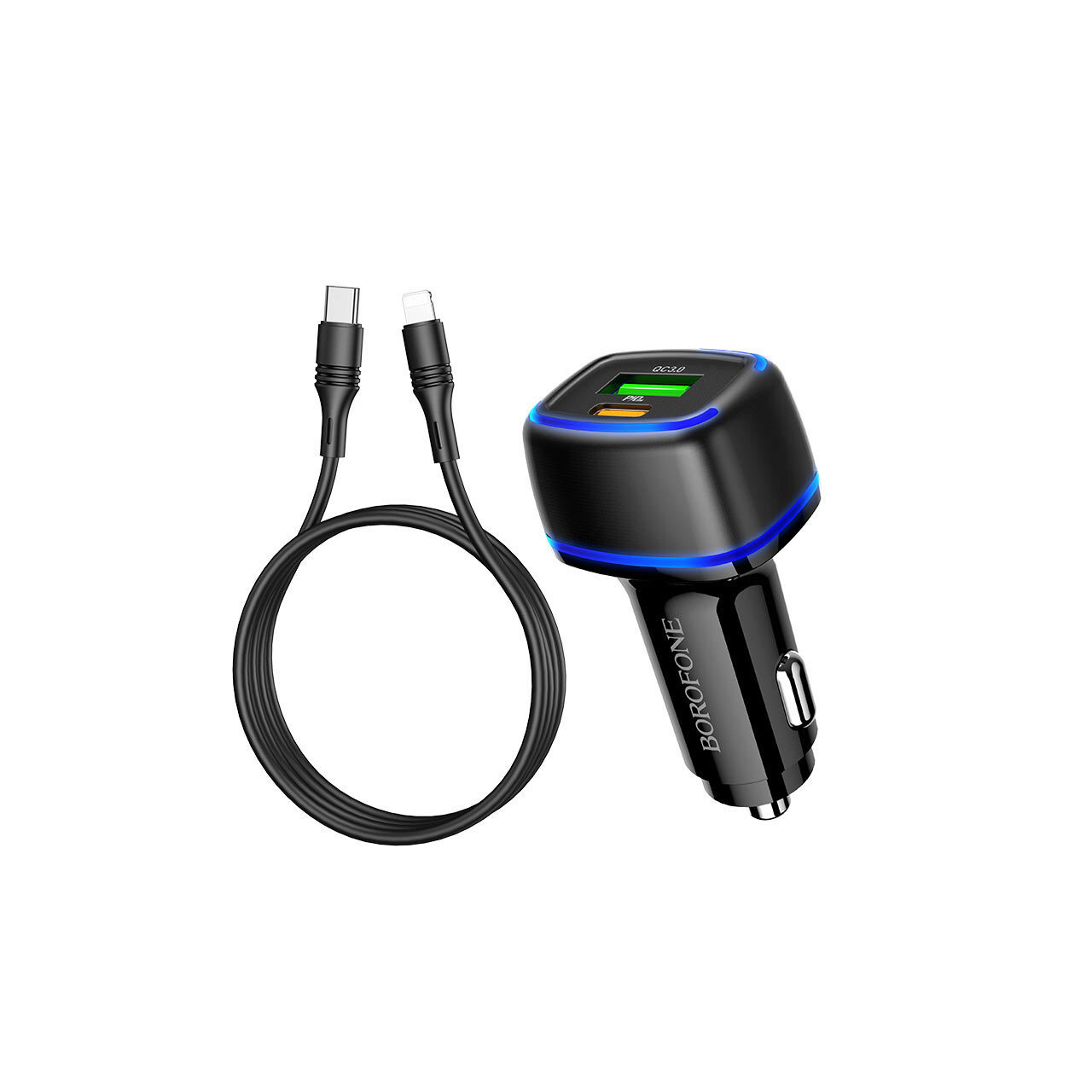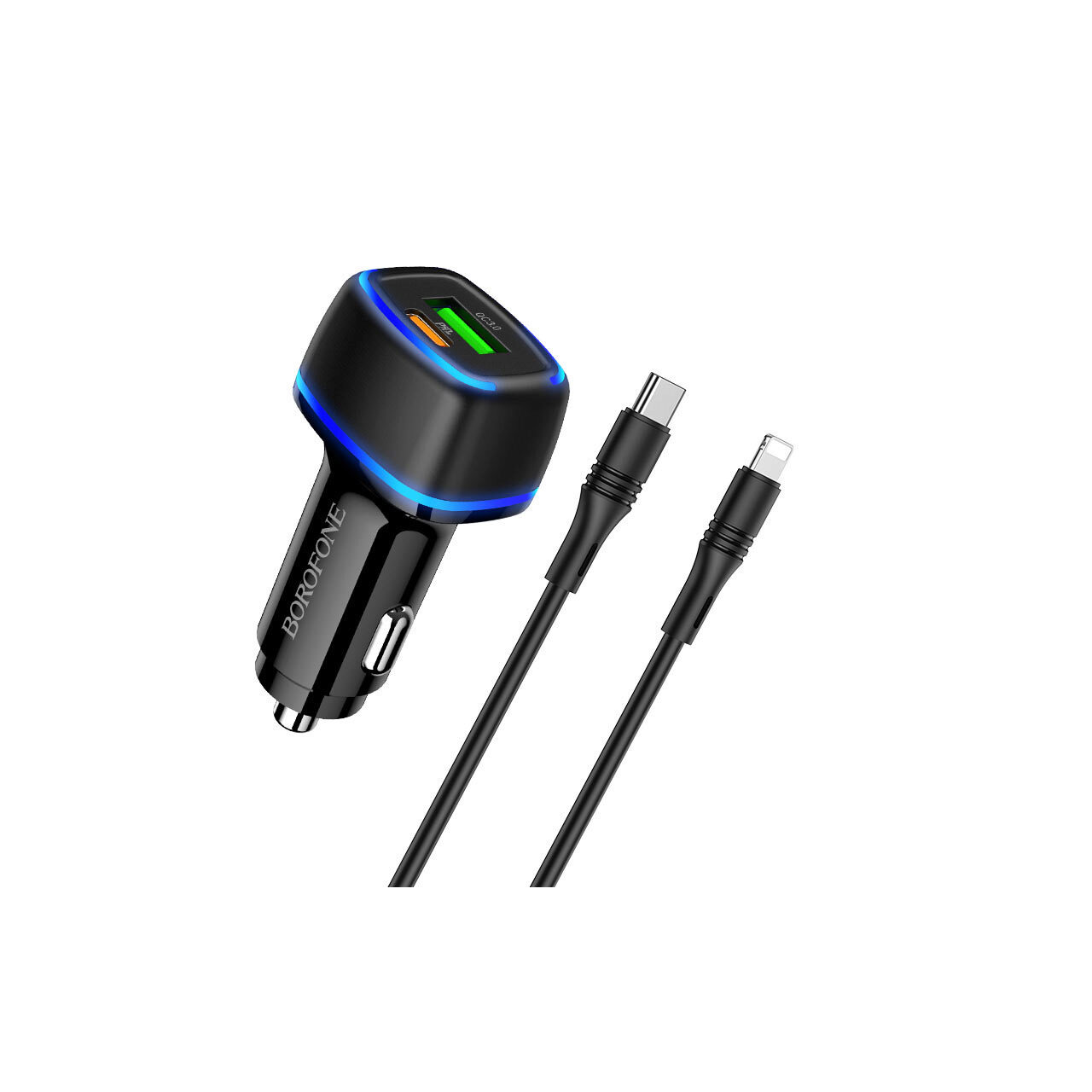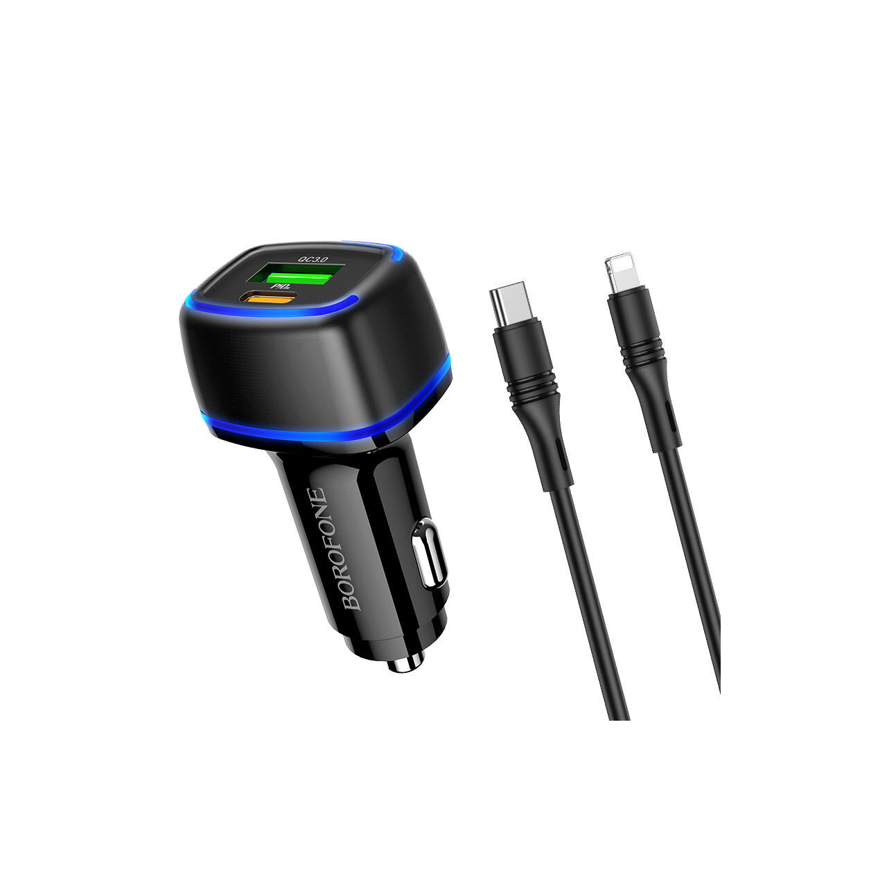 Set Incarcator Auto Borofone BZ14A Mercury cu cablu Type-C la Lightning, 1xUSB, 1xType-C, QC 3.0, Negru