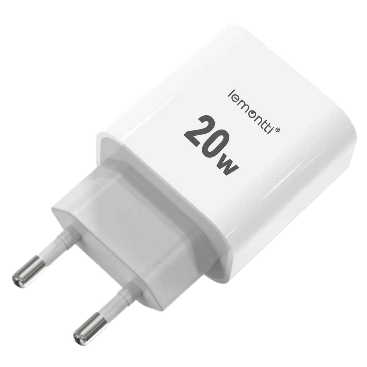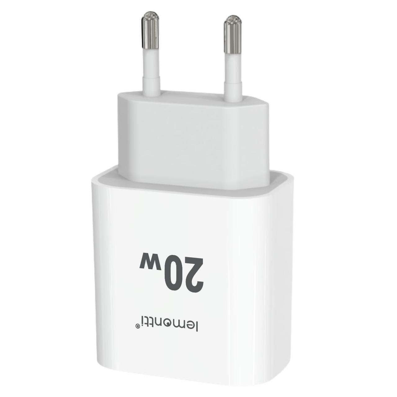 Lemontti Incarcator Retea Fast Charge 20W 1 x PD Type-C + 1 x USB-A Quick Charge 3.0 si cablu Type-C-Type-C 20W 1m Alb