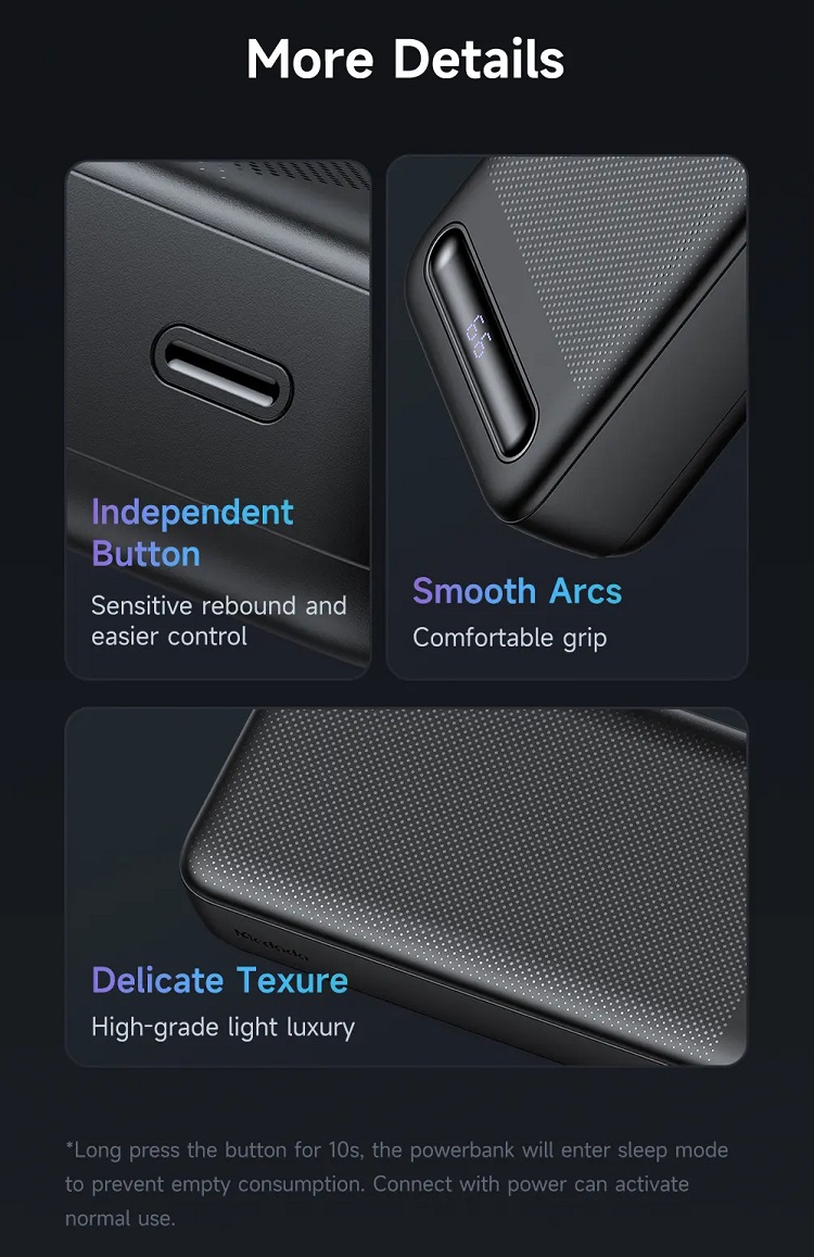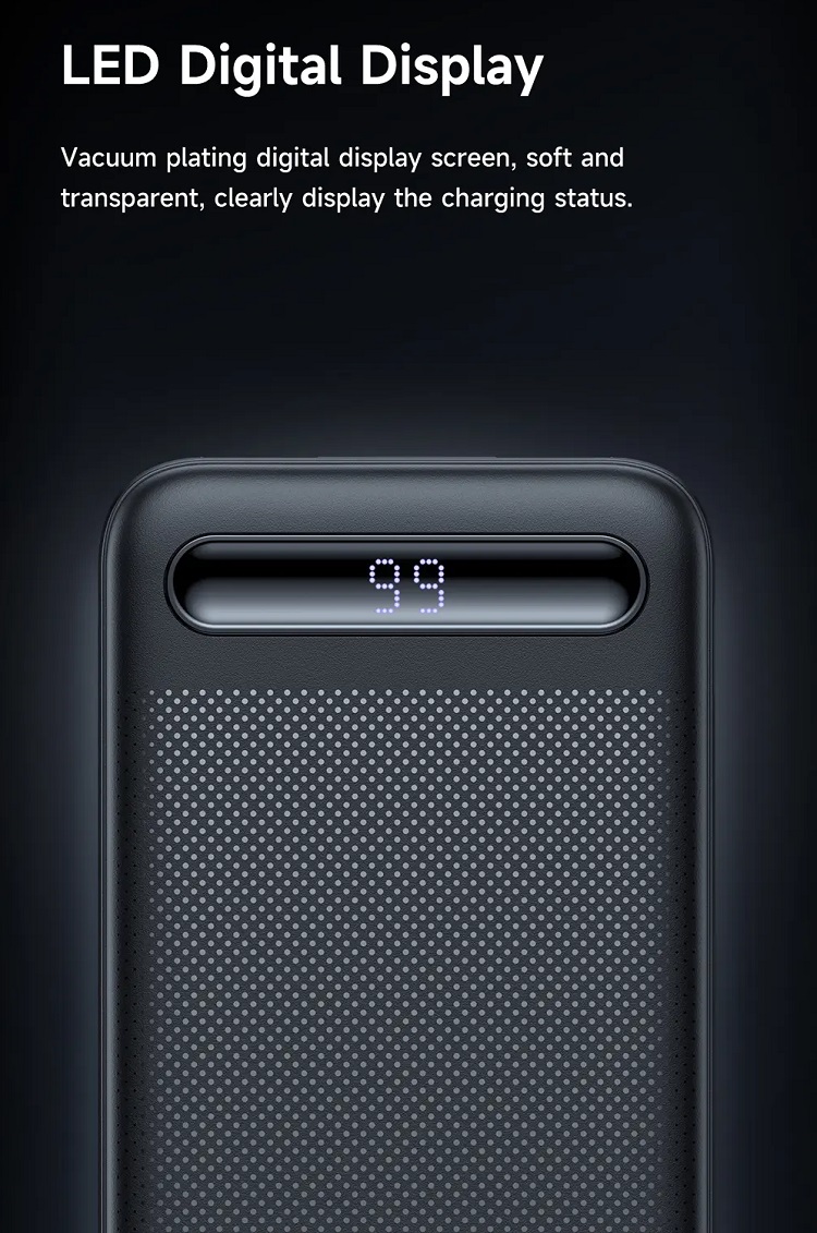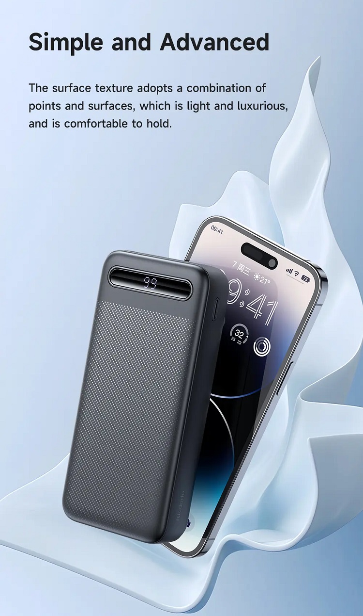 Textura suprafetei adopta o combinatie de puncte, este usoara si confortabil de tinut, iar afisajul digital placat cu vid moale si transparent afiseaza clar starea de incarcare.