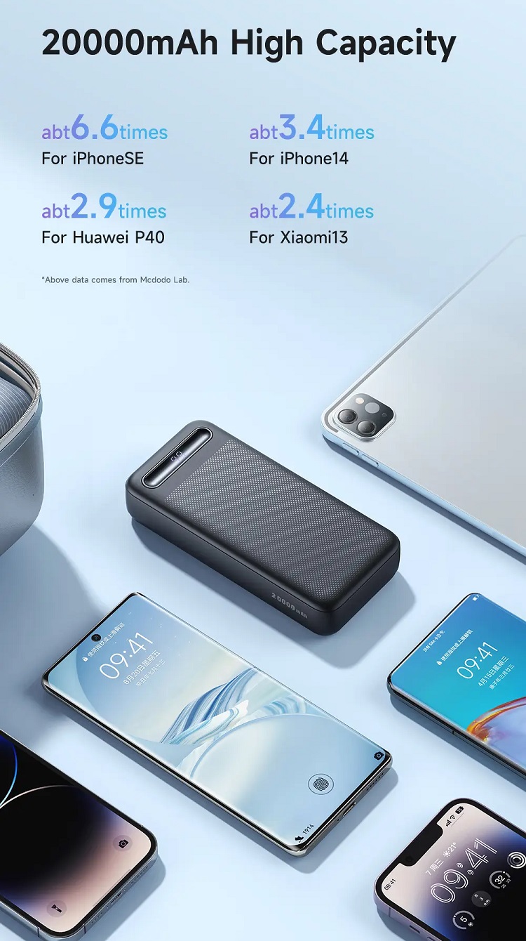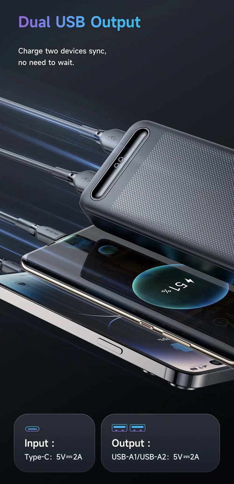 Acumulator Extern Star Series Digital Display 20000mAh de la Mcdodo, este o alegere excelenta pentru casa sau birou, iti poate incarca telefonul, tableta sau castile cu o putere de pana la 10.5 W cu ajutorul celor 2 porturi disponibile (2x USB-A )