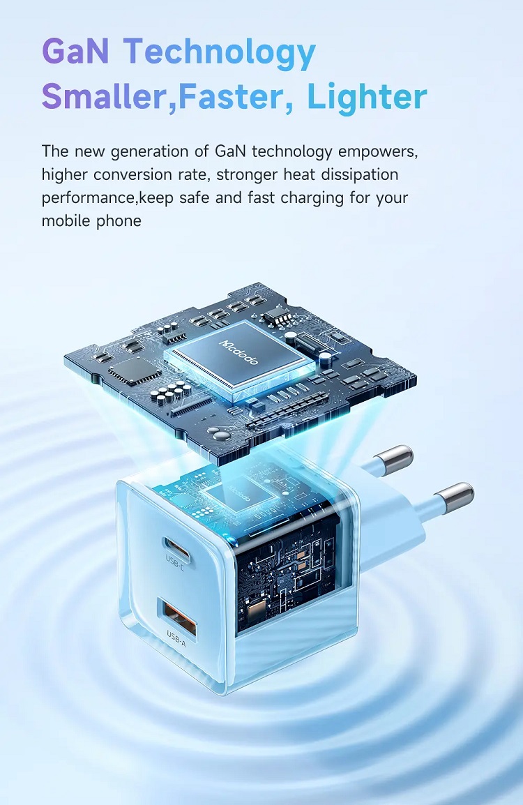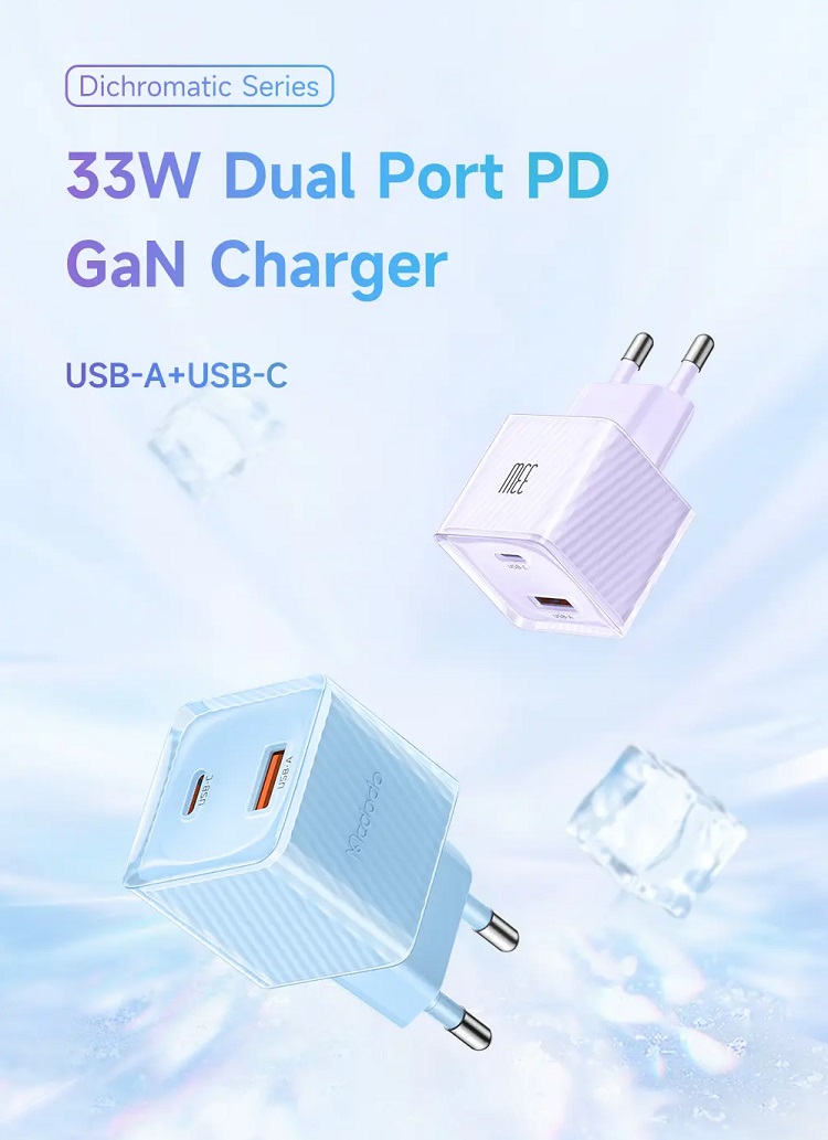 Incarcatorul Retea Dual Port Type-C si USB-A Dichromatic, Fast Charging PD 33W de la Mcdodo, are un design elegant si minimalist, a fost creat pe baza tehnologiei inovatoare GaN, cu o putere de pana la 33W va permite incarcarea a doua dispozitive simultan.
