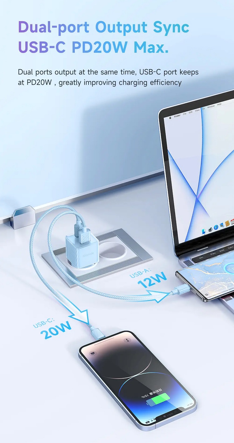 - USB-C + USB-A: 20W+12W (32W max.) (USB-C: 5V⎓2.4A, 9V⎓2.22A USB-A: 5V⎓2.4A)