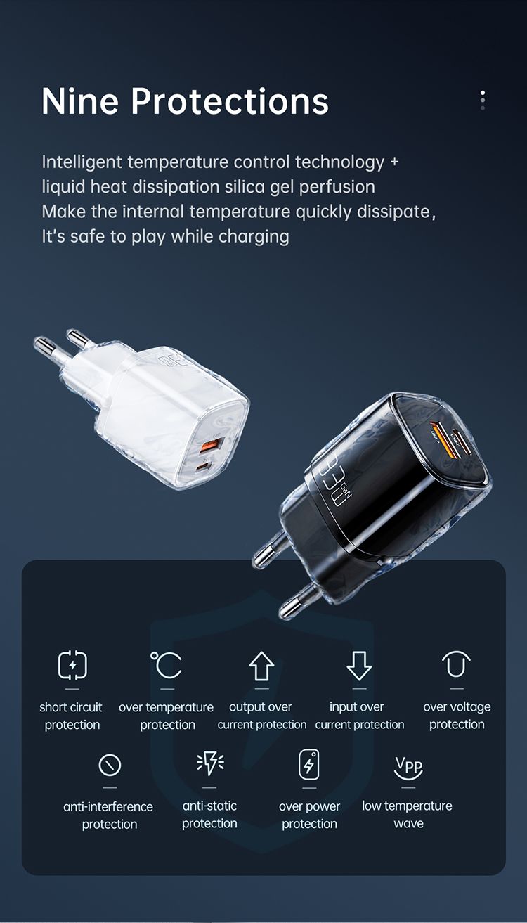 Cipul inteligent incorporat ofera protectie impotriva scurtcircuitului, supraincarcarii, supraincalzirii sau a altor interferente care pot afecta incarcarea corecta a dispozitivelor dumneavoastra. De asemenea, regleaza curentul pentru a se incarca cat mai repede posibil, fara a deteriora bateria.