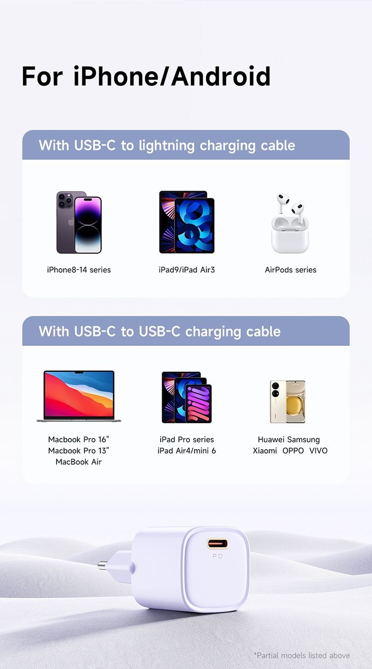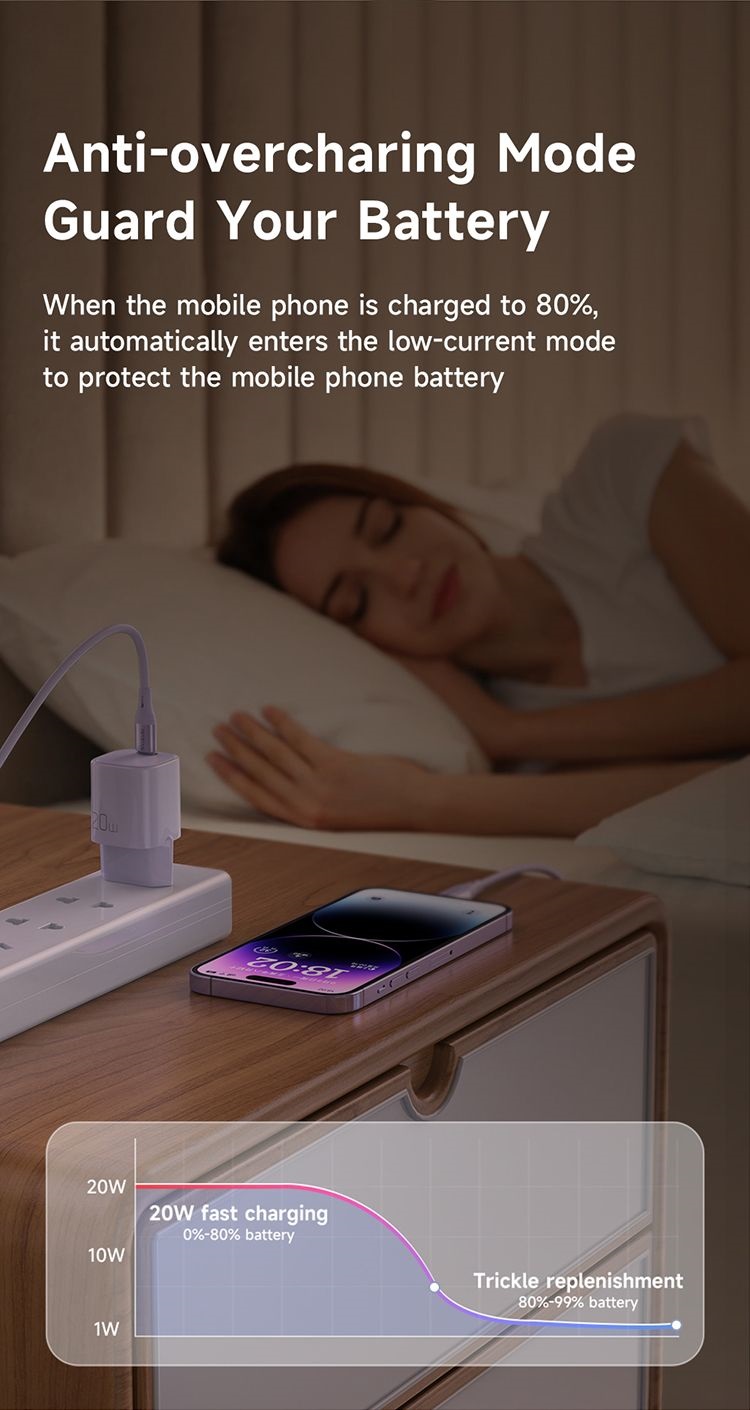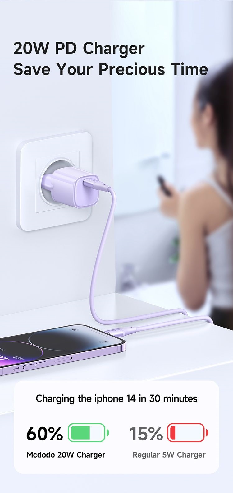 Incarcatorul accepta incarcare rapida PD cu o putere de pana la 20 W, aceasta inseamna ca va veti incarca iPhone 8-14 de pana la 4 ori mai rapid decat un incarcator standard! Dureaza doar 30 de minute pentru a incarca iPhone-ul de la 14 la 60%.