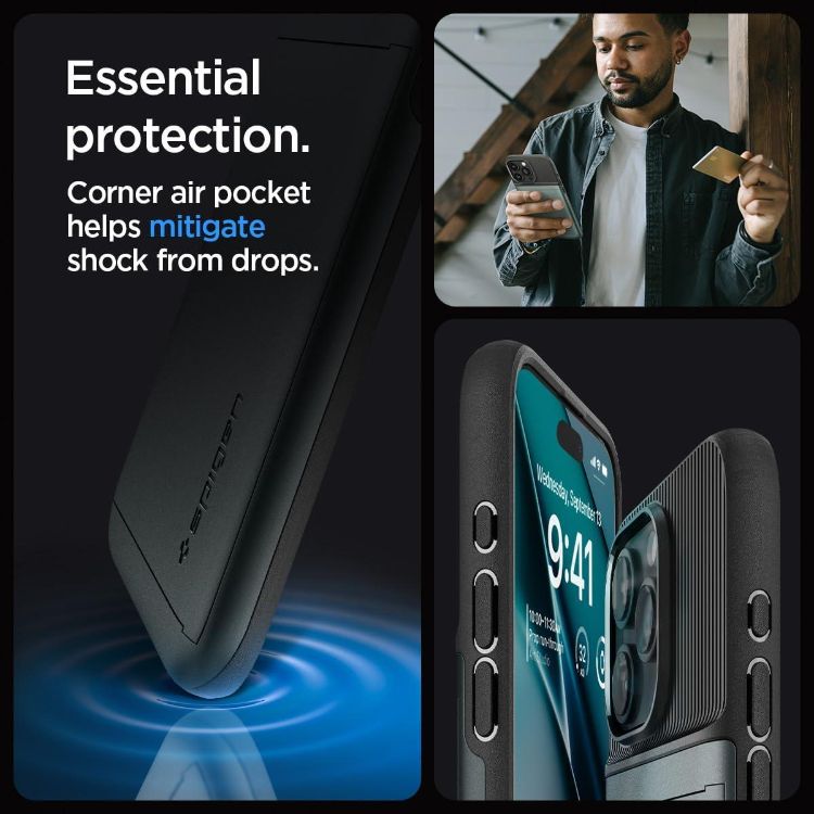 Husa Slim Armor Cs pentru iPhone 15 Pro Max iti ofera o tehnologie incorporata de absorbtie a socului pentru a-ti proteja dispozitivul impotriva impactului, din orice unghi.