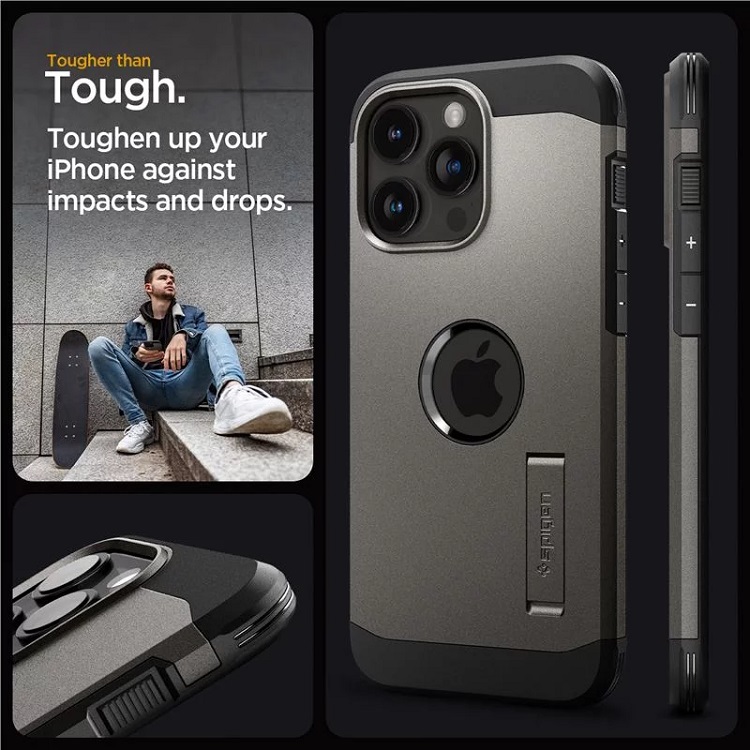 Husa Tough Armor de la Spigen pentru iPhone 15 Pro Max absoarbe socurile unei eventuale cazaturi cu succes datorita combinatiei de materiale de calitate folosite: invelis dur (Policarbonat) pe exterior, silicon moale pe margini si o extra protectie din spuma la interior. In plus colturile folosesc tehnologia Air Cushion ce diminueaza vibratiile socului. Este certificata military grade MIL-STD 810G-516.6 impotriva cazaturilor.