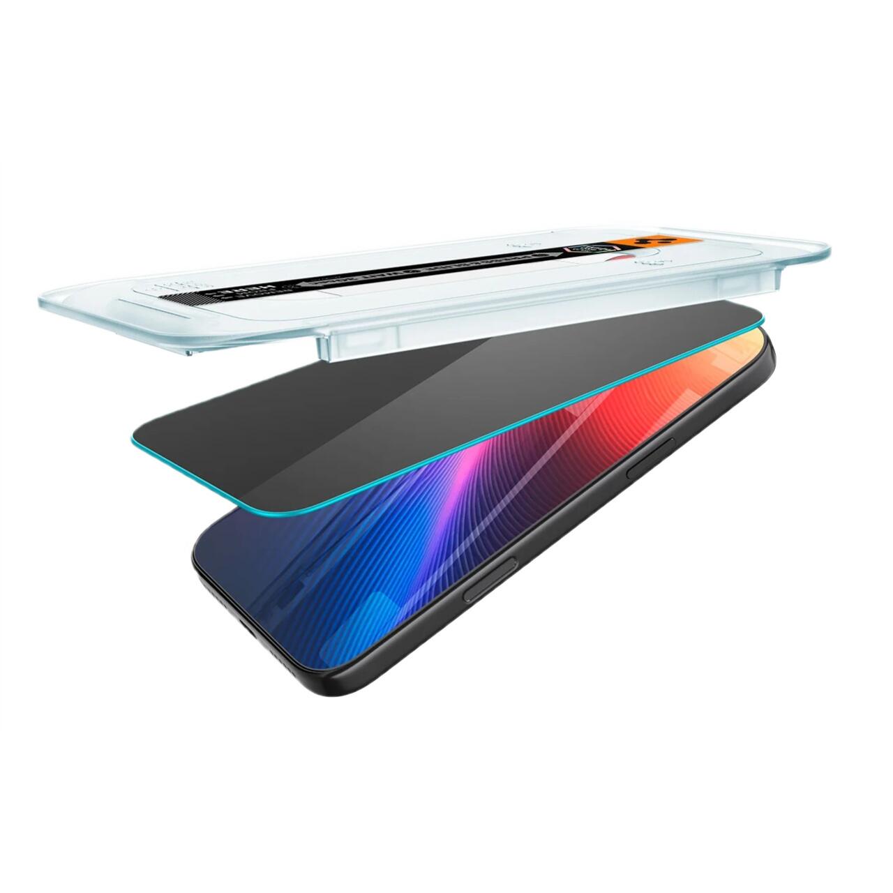 Pachet 2 buc Folie Sticla Privacy cu aplicator inclus de la Spigen, este protejata de un cadru de montaj perfect decupat in fata telefonului, datorita caruia il puteti pozitiona perfect pe ecran.