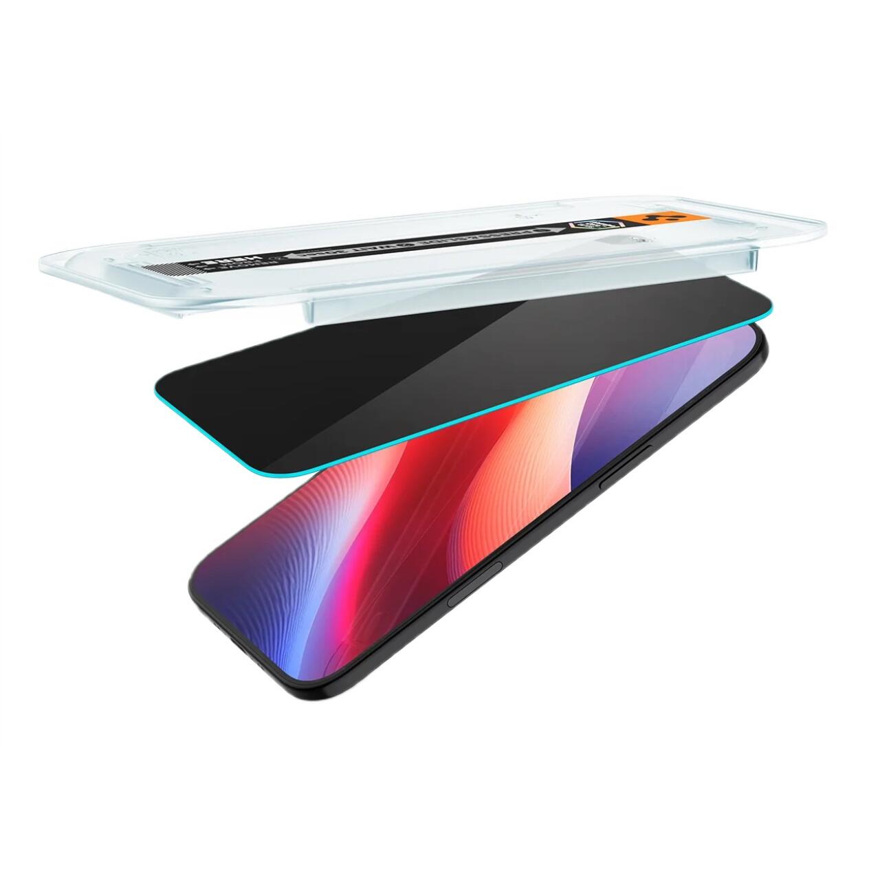 Pachet 2 buc Folie Sticla Privacy cu aplicator inclus de la Spigen, este protejata de un cadru de montaj perfect decupat in fata telefonului, datorita caruia il puteti pozitiona perfect pe ecran.