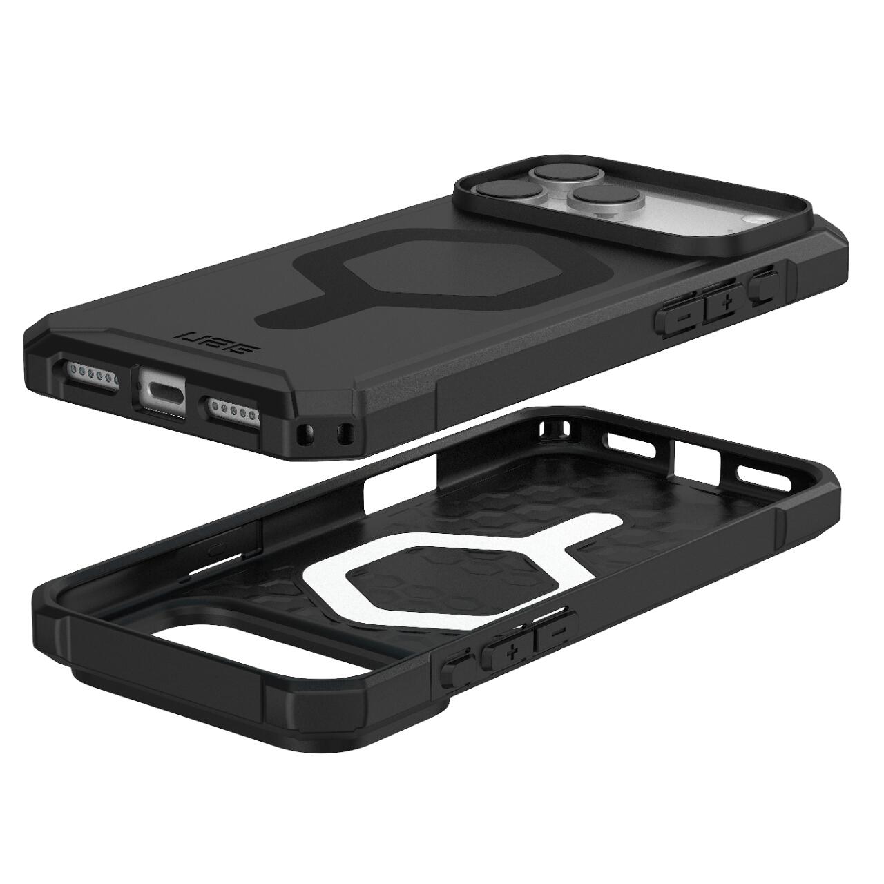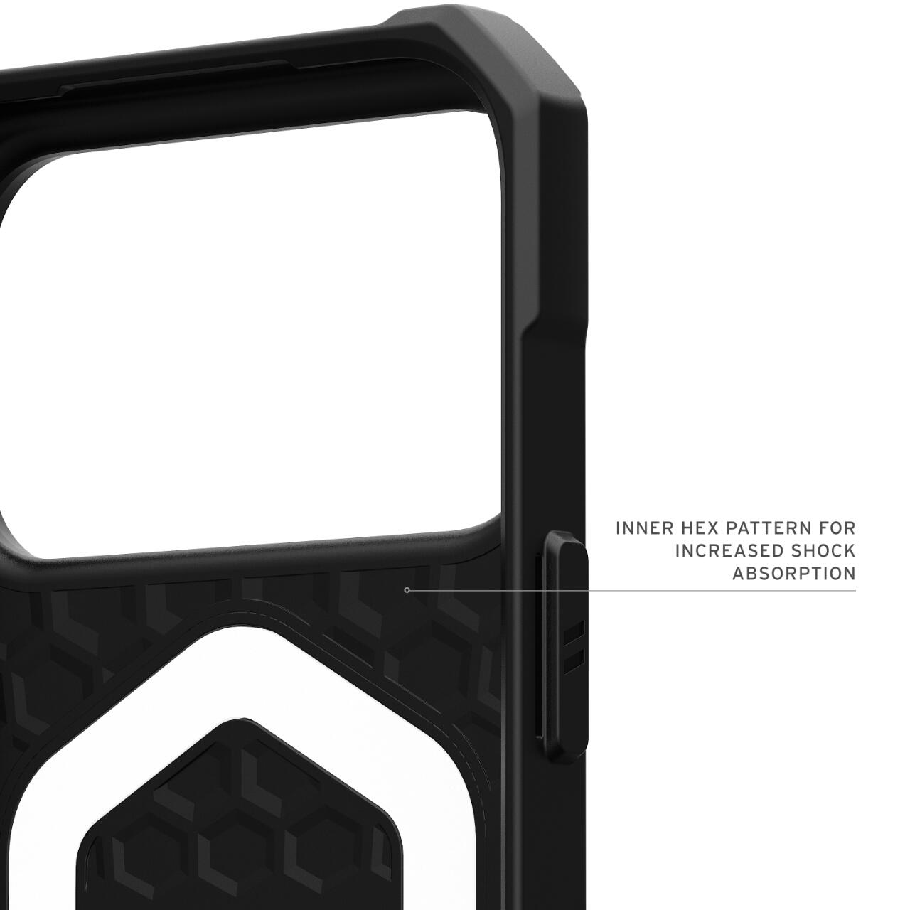 Husa Essential Armor Magsafe pentru iPhone 17 Pro Max de la UAG, ofera dispozitivului dumneavoastra un design subtire, ergonomic, protectie intarita pentru colturi, model hexagonal exterior pentru a dispersa impactul, proprietati antimicrobiene si o estetica UAG inconfundabila.