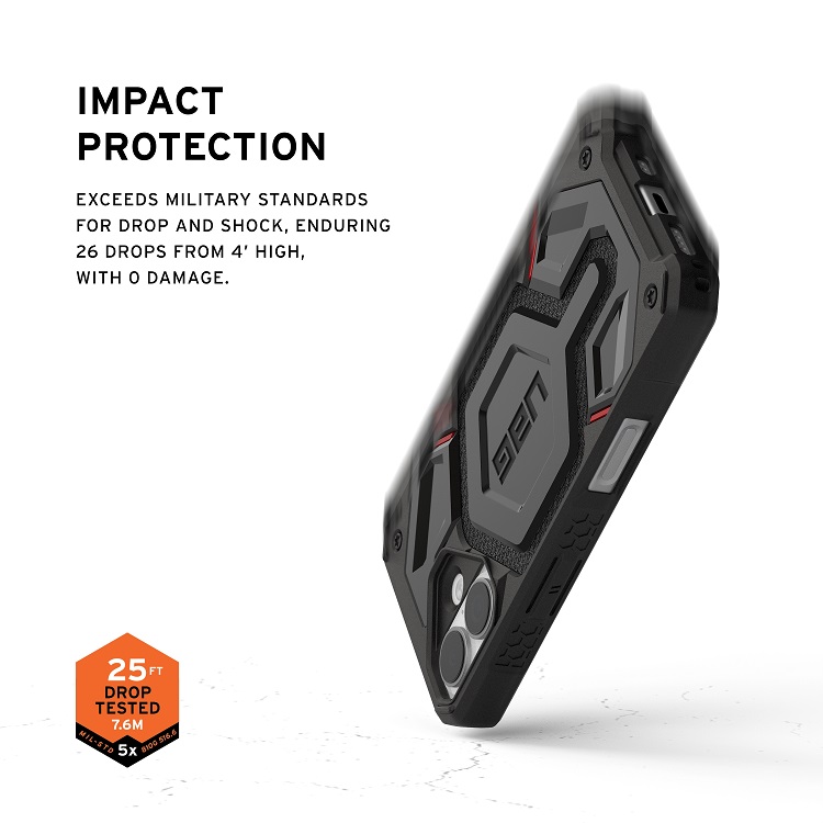 Husa Monarch Pro iPhone 17 de la UAG, combina 5 tipuri de materiale intr-o protectie premium ce rezista la cazaturi accidentale si zgarieturi. Marginile si interiorul sunt realizate din cauciuc flexibil, iar colturile sunt evidentiate si intarite pentru a prelua socurile cu succes.