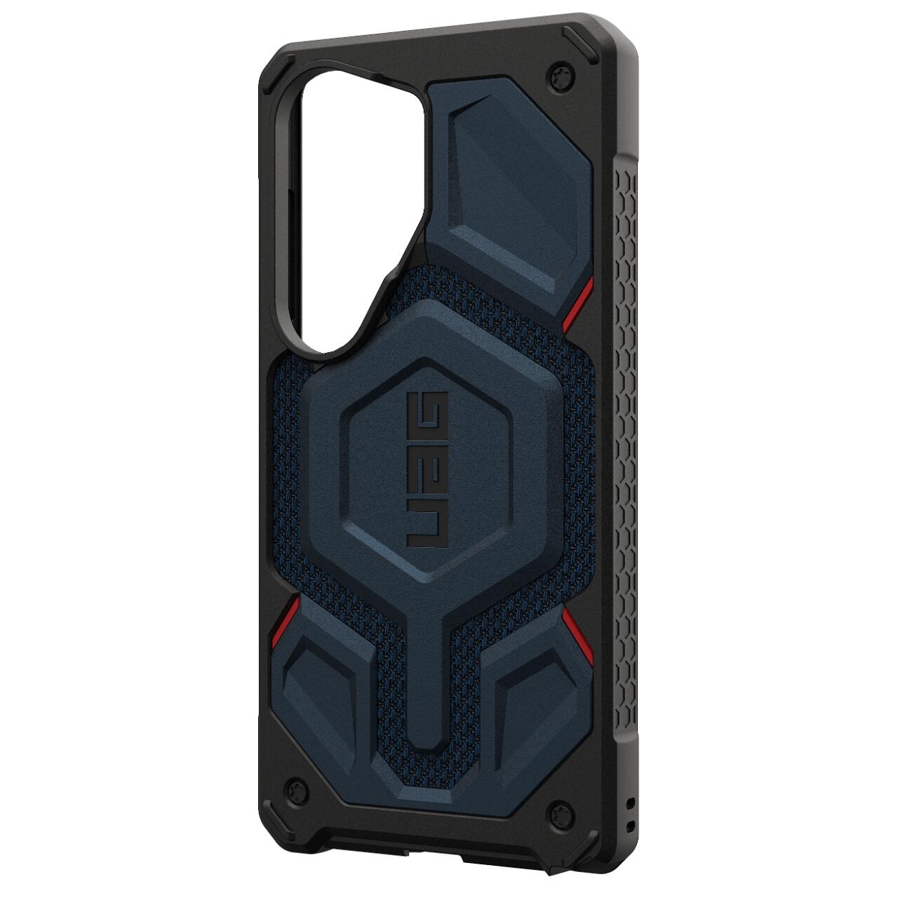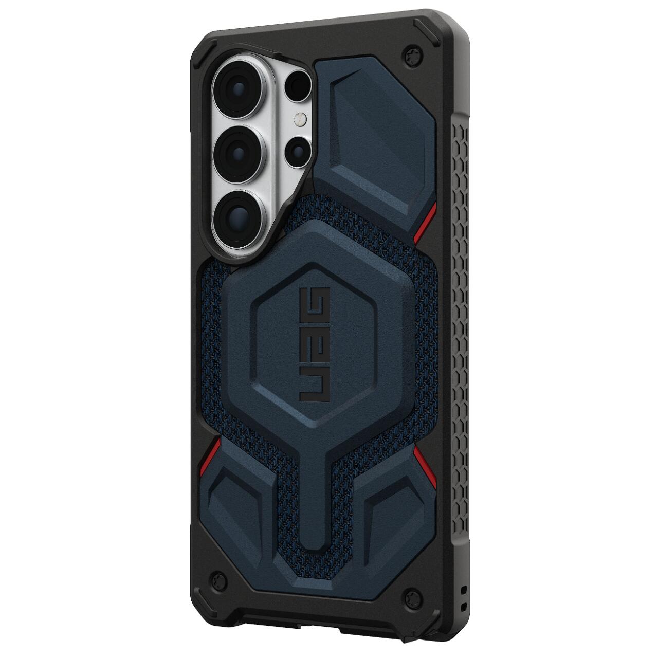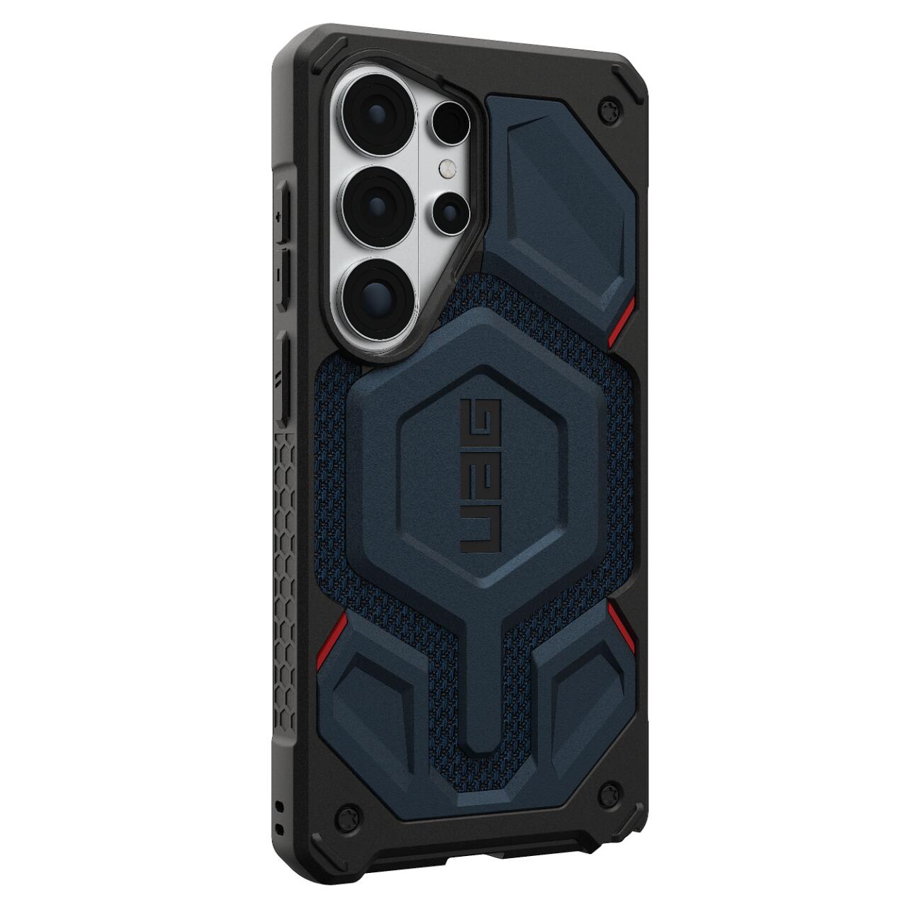 Husa Monarch Pro Magnetic Samsung Galaxy S26 Ultra de la UAG, combina 5 tipuri de materiale intr-o protectie premium ce rezista la cazaturi accidentale si zgarieturi. Este o protectie usoara in ciuda aspectului masiv, iar design-ul este unul special atat datorita combinatiei de multiple materiale cat si datorita finisajelor specifice UAG. Husa este robusta, texturata pe spate si pe margini oferind o mai buna aderenta in mana.