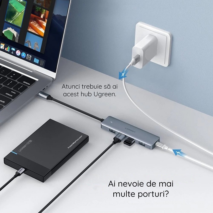 Tehnologia evolueaza rapid, iar hub-ul Ugreen face legatura perfecta intre dispozitivele tale clasice si laptopurile moderne. Bucura-te de transfer rapid de date, incarcare rapida si imagine 4K, fara compromisuri.