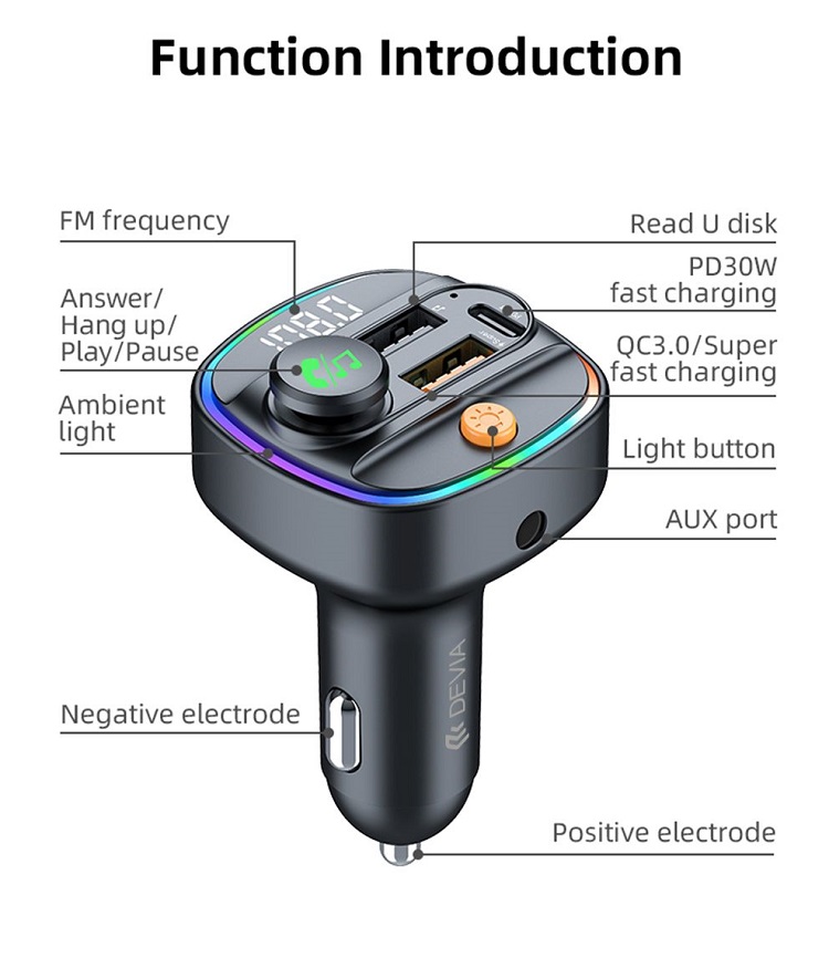 Adaptorul auto Devia este conceput pentru confortul utilizatorului, designul sau compact si elegant se potriveste cu usurinta in priza de bricheta a masinii tale, iar comenzile intuitive faciliteaza comutarea intre canale FM, reglarea volumului si gestionarea apelurilor. Afisajul LED ofera o vizibilitate clara a frecventei FM si a starii de incarcare.