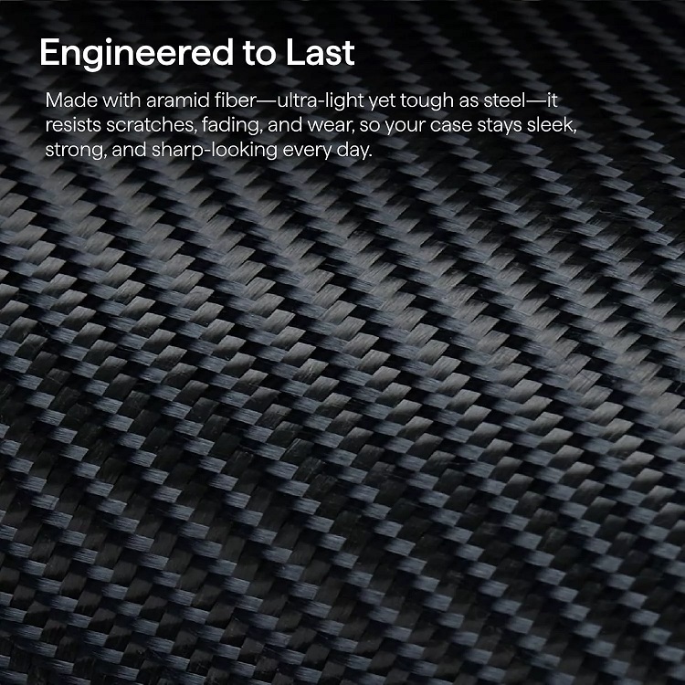 Husa Pitaka MagEZ 7 600D Ultra-Slim Aramida Magsafe pentru iPhone 17 Pro Max fabricata din fibra de aramida utilizata in industria aerospatiala, care este de 5 ori mai puternica decat otelul si cantareste doar 1/5 din greutatea acestuia. Este ultra-subtire, incredibil de durabila si conceputa pentru protectie premium - fara volum inutil.