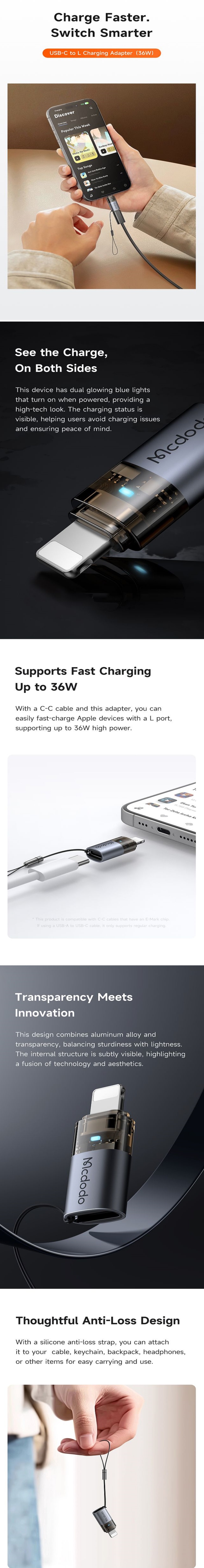 Mcdodo Adaptor Type-C la Lightning OTG 36W, aliaj de aluminiu, incarcare si sincronizare date, lumina albastra, snur, Negru