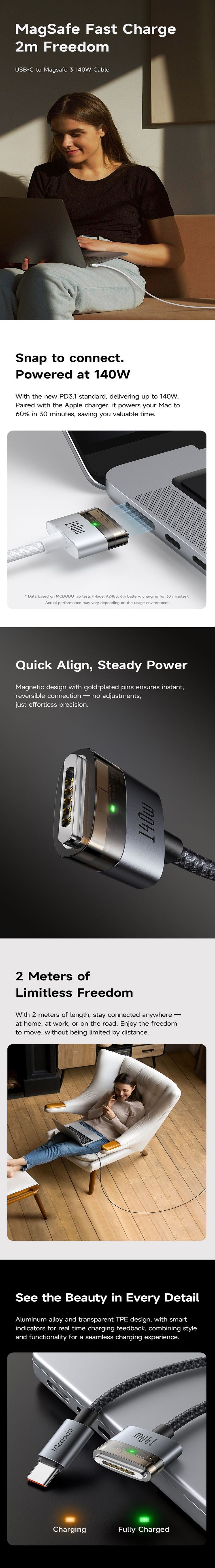 Mcdodo Cablu Type-C la MagSafe, ofera o solutie rapida si sigura pentru incarcarea MacBook-urilor. Cu o putere de pana la 140W, acesta permite incarcarea eficienta a dispozitivului, ajungand pana la 60% din capacitatea bateriei unui MacBook Pro 16” in doar 30 de minute. Astfel, economisesti timp pretios si beneficiezi de performanta constanta.