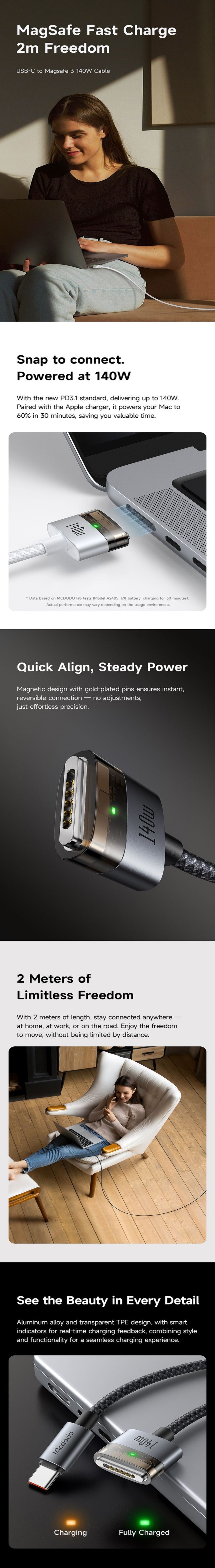 Mcdodo Cablu Type-C la MagSafe, ofera o solutie rapida si sigura pentru incarcarea MacBook-urilor. Cu o putere de pana la 140W, acesta permite incarcarea eficienta a dispozitivului, ajungand pana la 60% din capacitatea bateriei unui MacBook Pro 16” in doar 30 de minute. Astfel, economisesti timp pretios si beneficiezi de performanta constanta.