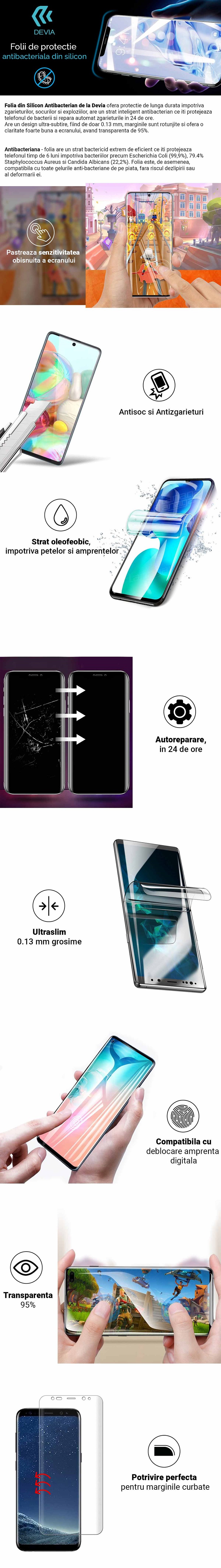 Folia din Silicon de la Devia ofera protectie de lunga durata impotriva zgarieturilor, socurilor si exploziilor, are un strat inteligent antibacterian ce iti protejeaza telefonul de bacterii si repara automat zgarieturile in 24 de ore. Are un design ultra-subtire, fiind de doar 0.13 mm, marginile sunt rotunjite si ofera o claritate foarte buna a ecranului, avand transparenta de 95%.
