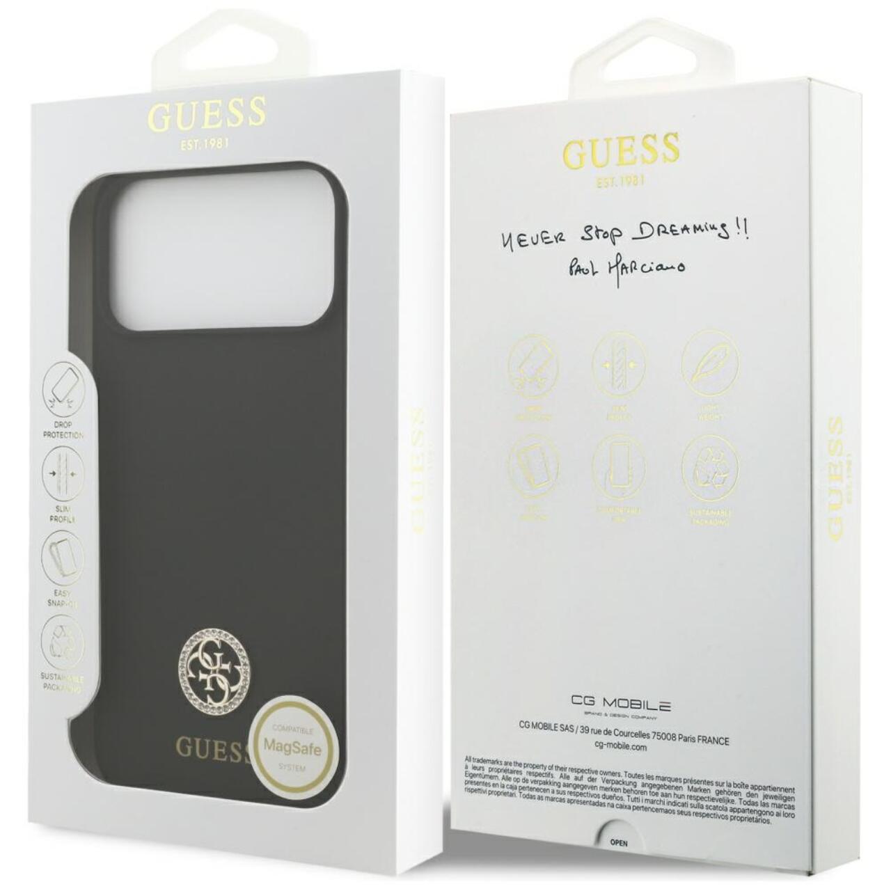 Husa Silicone Logo Strass 4G MagSafe iPhone 17 Pro Max de la Guess, este realizata din silicon si TPU imbina protectia eficienta cu un design modern si placut la atingere. Materialele premium ofera o textura fina si o aderenta excelenta, prevenind alunecarea accidentala a telefonului din mana.