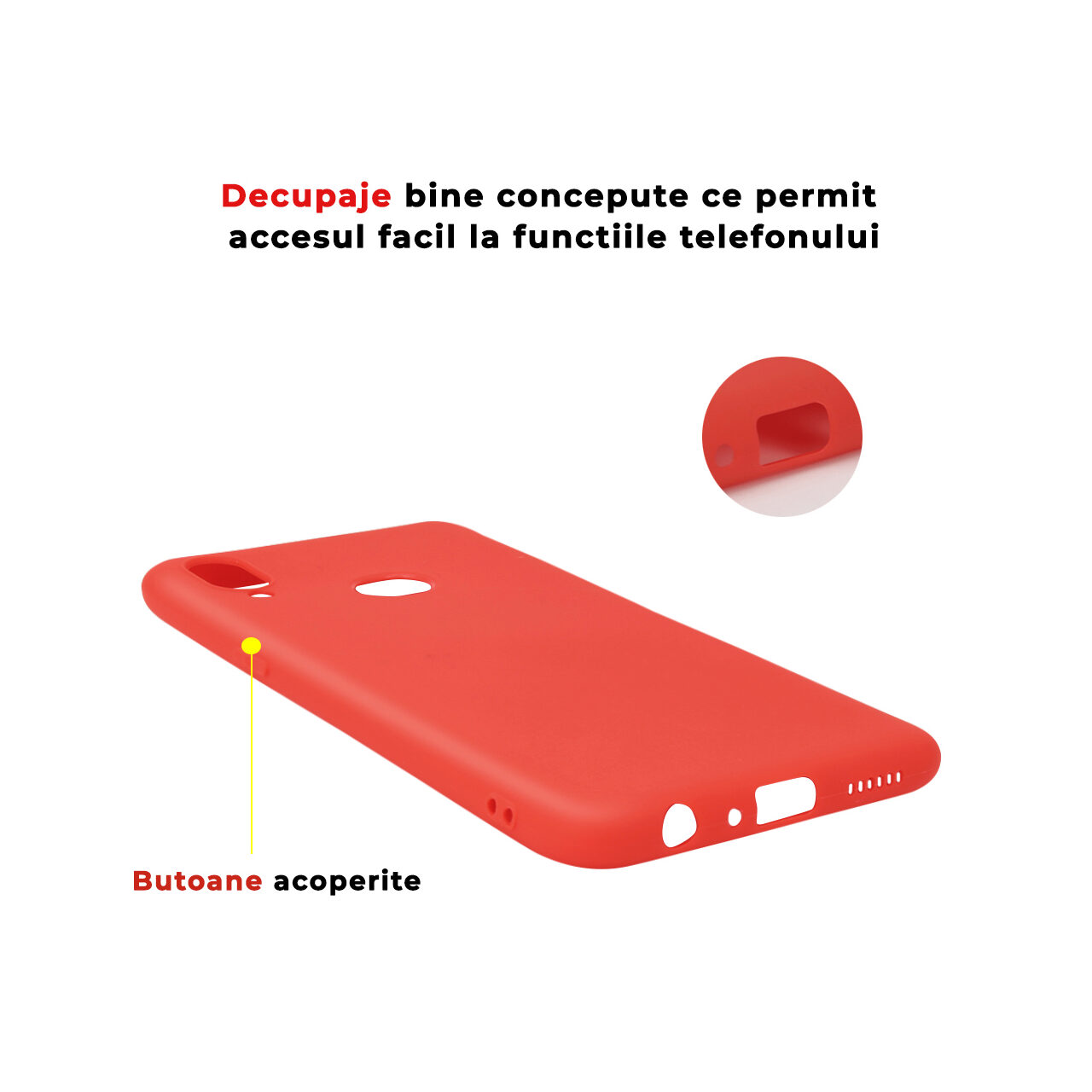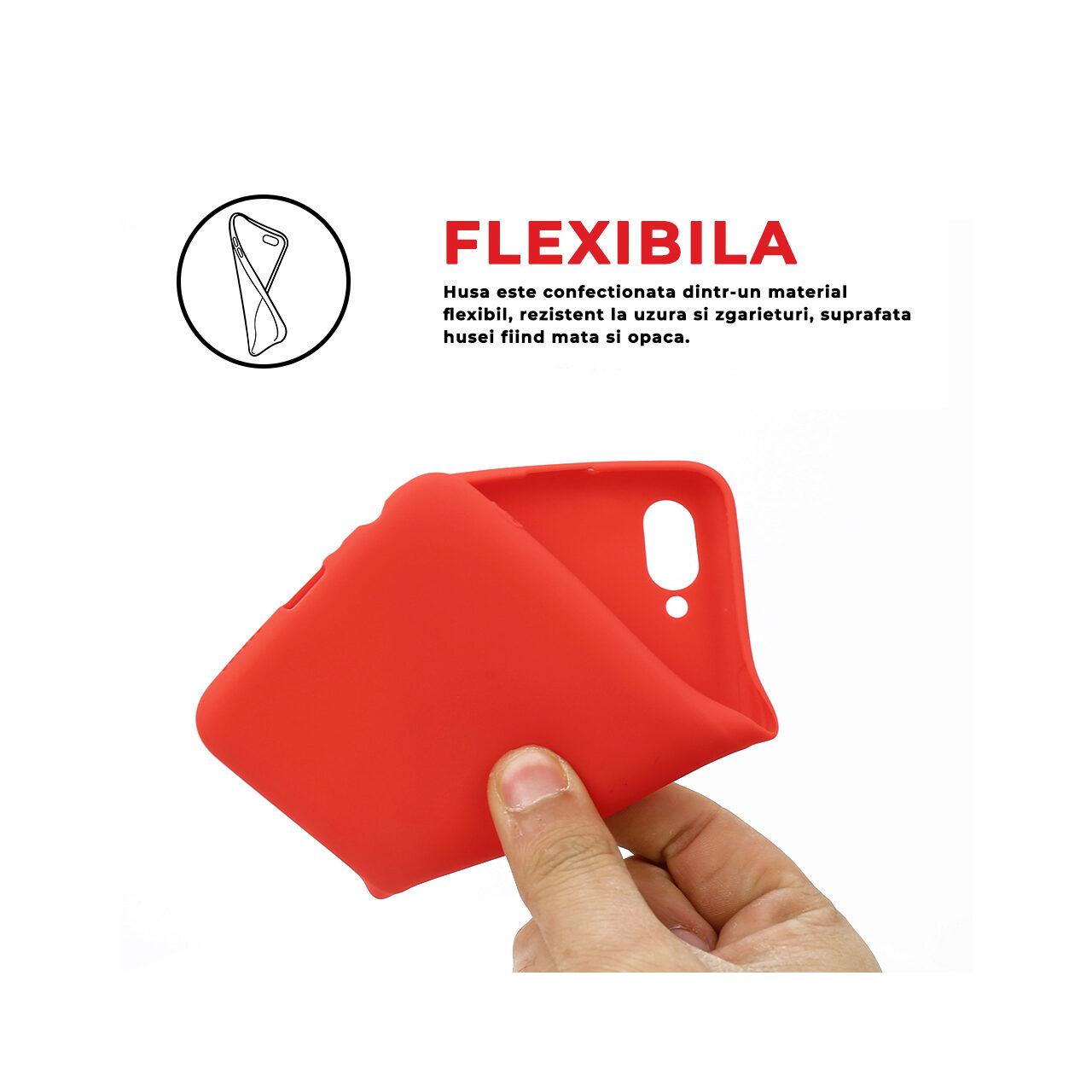 Carcasa este confectionata dintr-un material flexibil, rezistent la uzura si zgarieturi, suprafata husei fiind mata si opaca. Aplicarea protectiei din silicon se realizeaza usor datorita materialului elastic din care este confectionata. Decupajele sunt bine concepute si permit accesul facil la functiile telefonului.