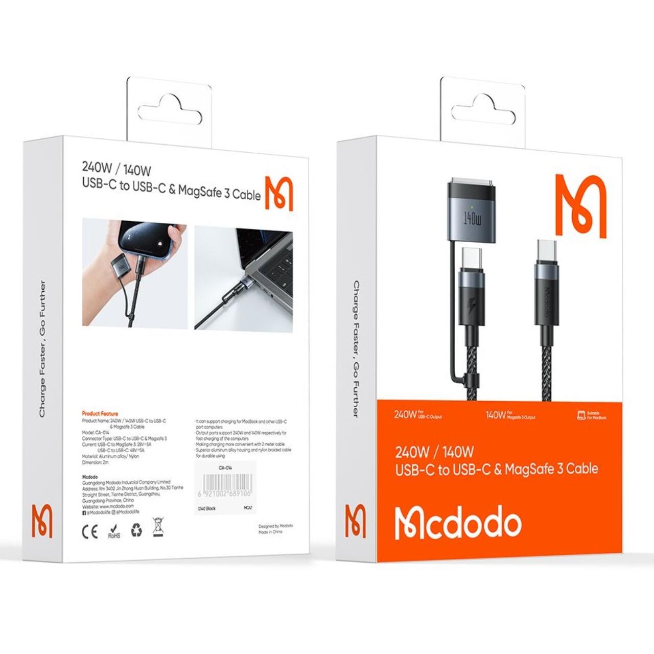 Mcdodo Cablu 2 in 1 Type-C la Type-C, este un cablu care nu numai ca indeplineste, dar depaseste asteptarile, oferind fiabilitate, viteza si confort. Cu doi conectori diferiti - USB-C la MagSafe 3 si USB-C la USB-C - este ideal pentru posesorii unei varietati de dispozitive. Acesta ofera o putere de pana la 240W (pentru USB-C), iar cipul E-Marker incorporat asigura o incarcare rapida si stabila, avand grija in acelasi timp de siguranta.