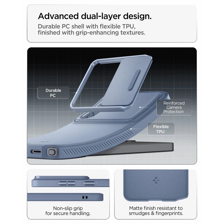 Husa Optik Armor Samsung Galaxy S26 Ultra de la Spigen, este conceputa pentru a oferi o protectie eficienta si practica dispozitivului tau. Constructia combina un strat flexibil din TPU cu un element rigid din policarbonat (PC), asigurand un echilibru ideal intre rezistenta si confort in utilizare.