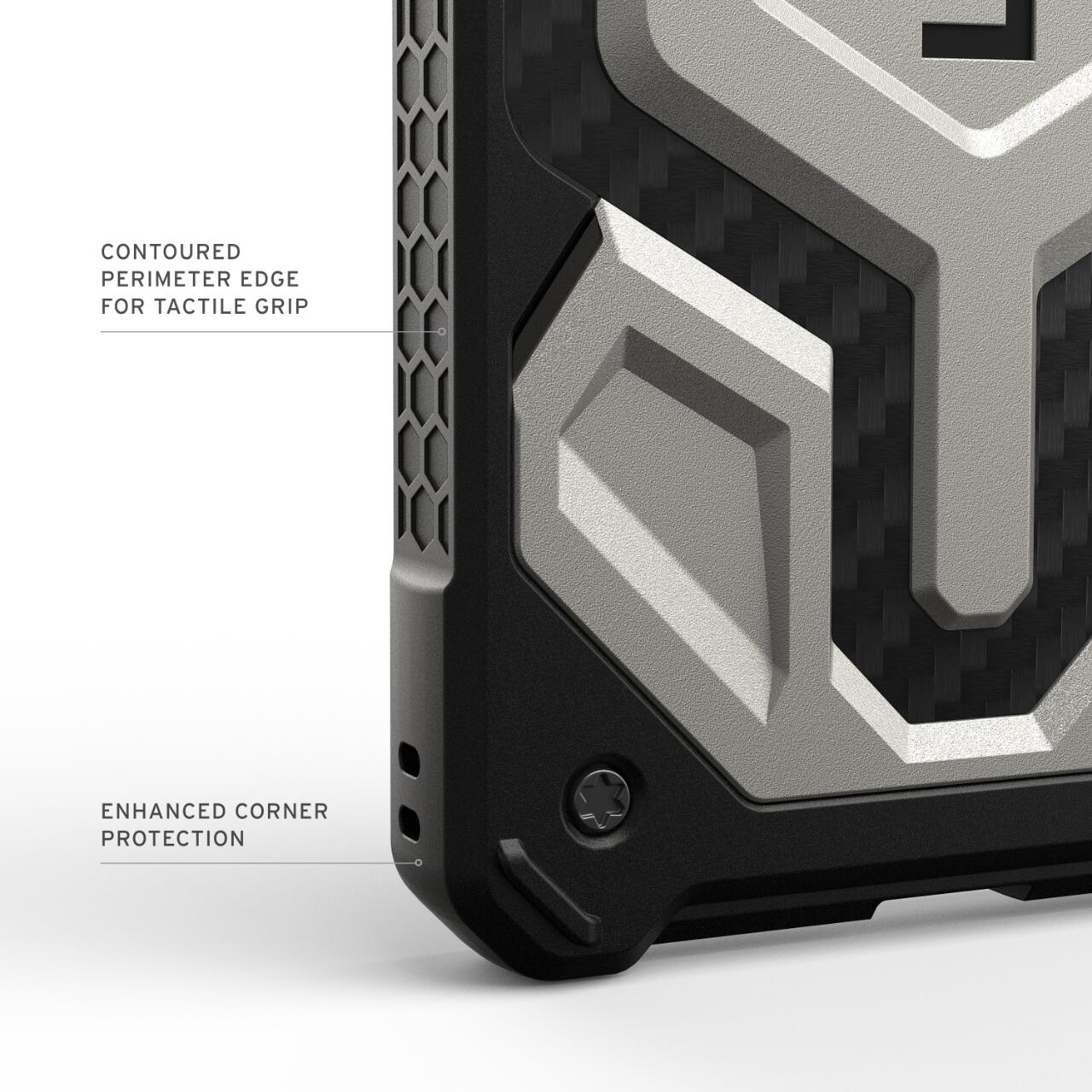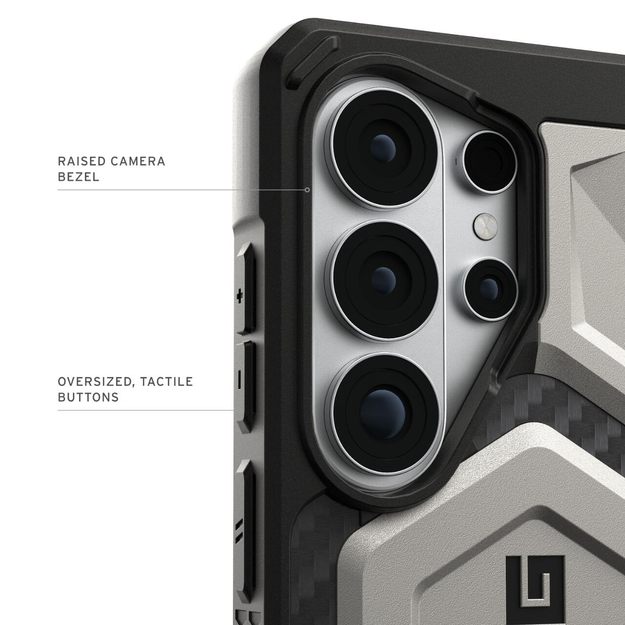 Husa Monarch Pro Magnetic Samsung Galaxy S26 Ultra de la UAG, combina 5 tipuri de materiale intr-o protectie premium ce rezista la cazaturi accidentale si zgarieturi. Este o protectie usoara in ciuda aspectului masiv, iar design-ul este unul special atat datorita combinatiei de multiple materiale cat si datorita finisajelor specifice UAG. Husa este robusta, texturata pe spate si pe margini oferind o mai buna aderenta in mana.