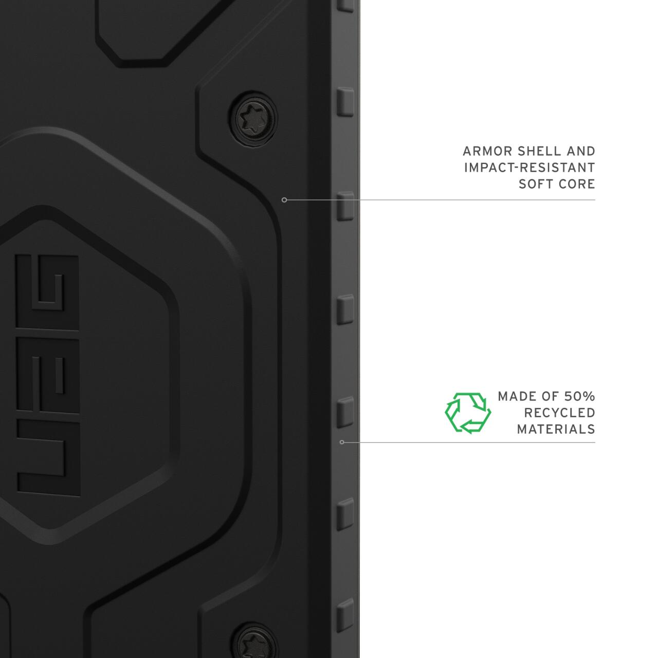 Constructie ecologica: Fabricat cu 50% materiale reciclate post-consum (PCR), combinand durabilitatea cu protectia de inalta performanta.