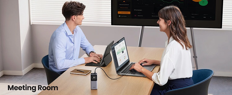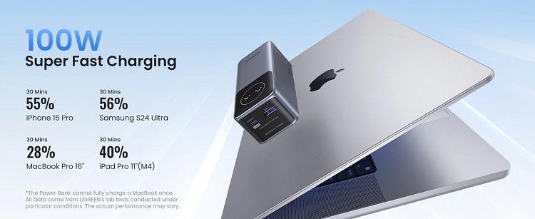 Dispozitivul suporta incarcare de pana la 100W, permitand alimentarea rapida a laptopurilor, tabletelor si telefoanelor.